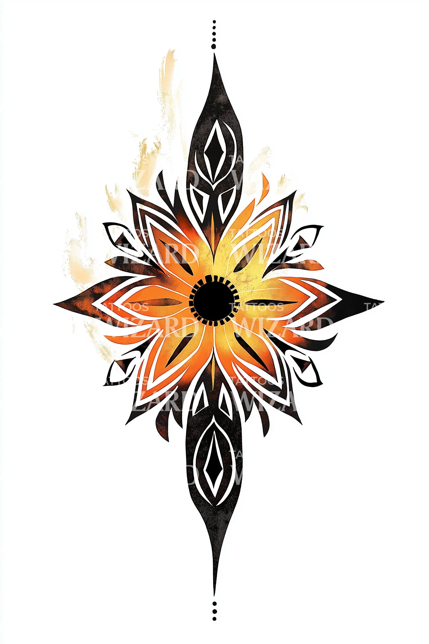 这款引人注目的纹身设计融合了部落的真实感与华丽的细节。以一朵燃烧着火焰的鲜艳橙色星花为中心,周围环绕着复杂的尖刺,彰显大胆风格。非常适合热爱独特且美学出众的身体艺术的你,这款部落风格的纹身设计无疑是一件杰出的作品。