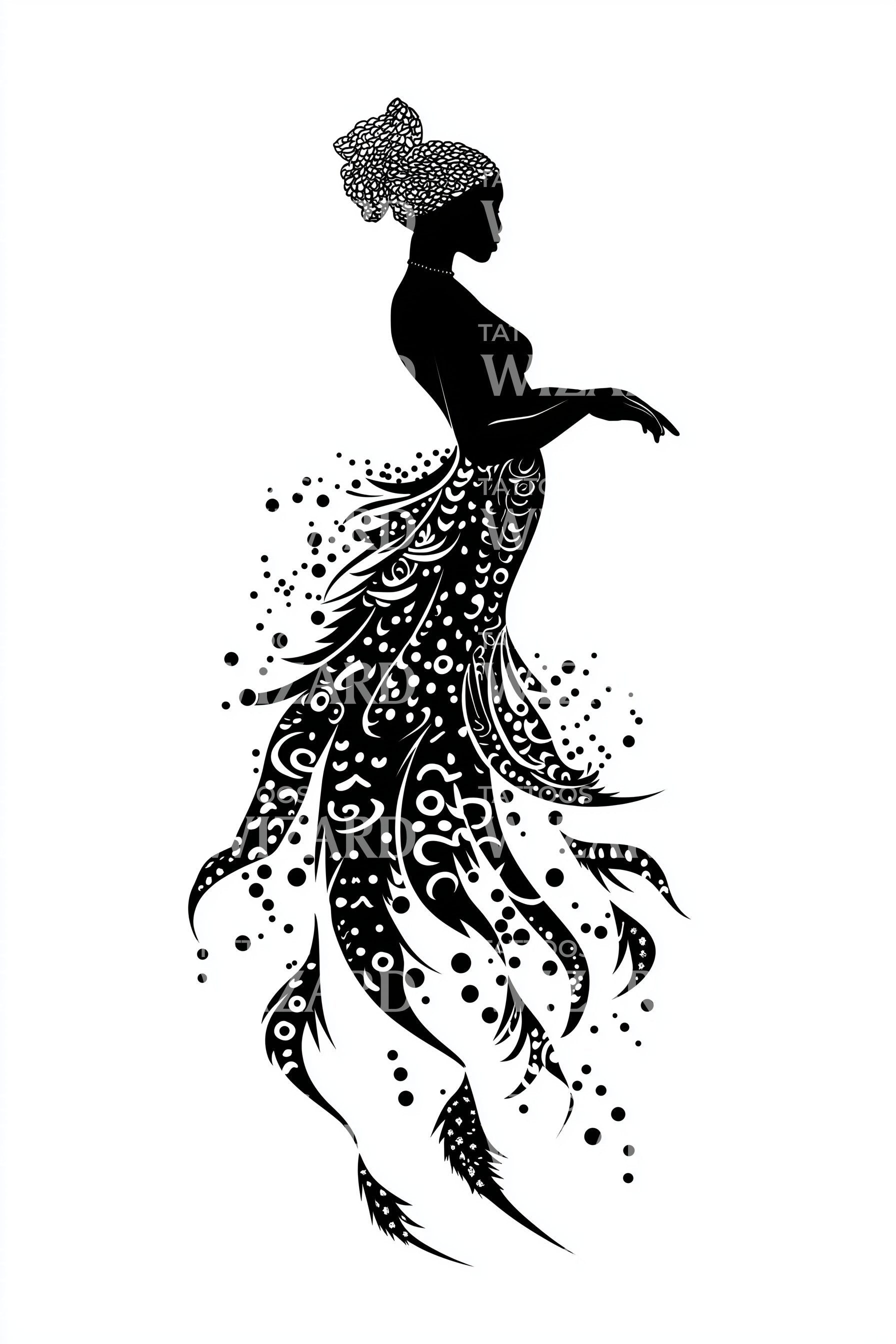 约鲁巴缪斯的装饰性剪影,头戴质感丰富的盖勒头巾,延展成星光点缀的旋转图案裙装。星座象征祖先的指引;流动的形态致敬优雅、美丽与成长。佩戴如同静谧的力量与月光下的从容。理想位置:肋骨处呈瀑布状,腿部呈扫掠状,脊柱/背部呈垂直流动,小腿处渐细收尾。