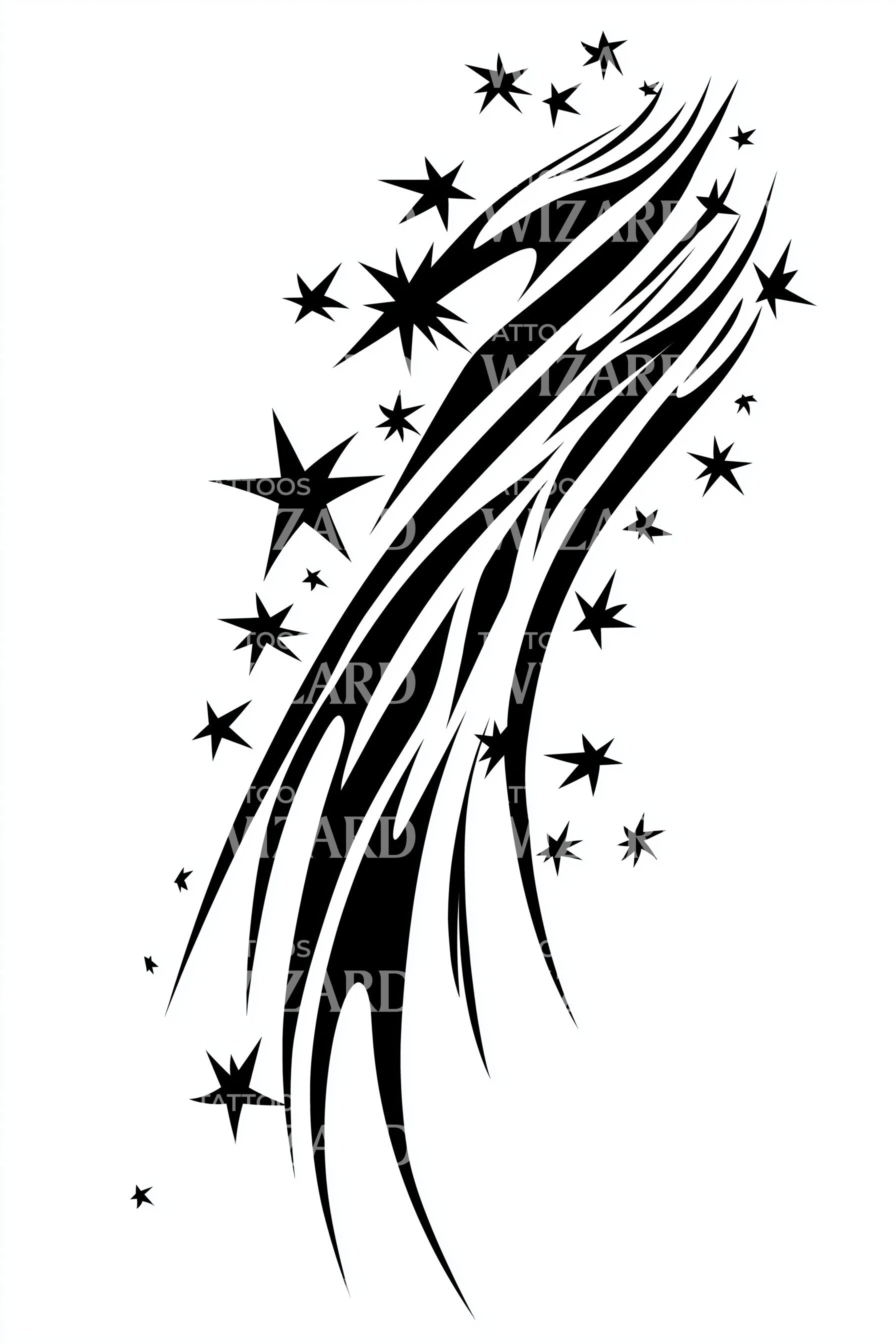 沉浸于宇宙之美,感受我们的黑灰纹身设计。设计中包含闪耀的星星、醒目的彗星和迷人的尾迹,全部以优雅的旋涡风格呈现。这幅天体杰作将你的身体化作夜空的画布,彰显你对宇宙的热爱与探索,尽显大胆的黑灰纹身艺术。
