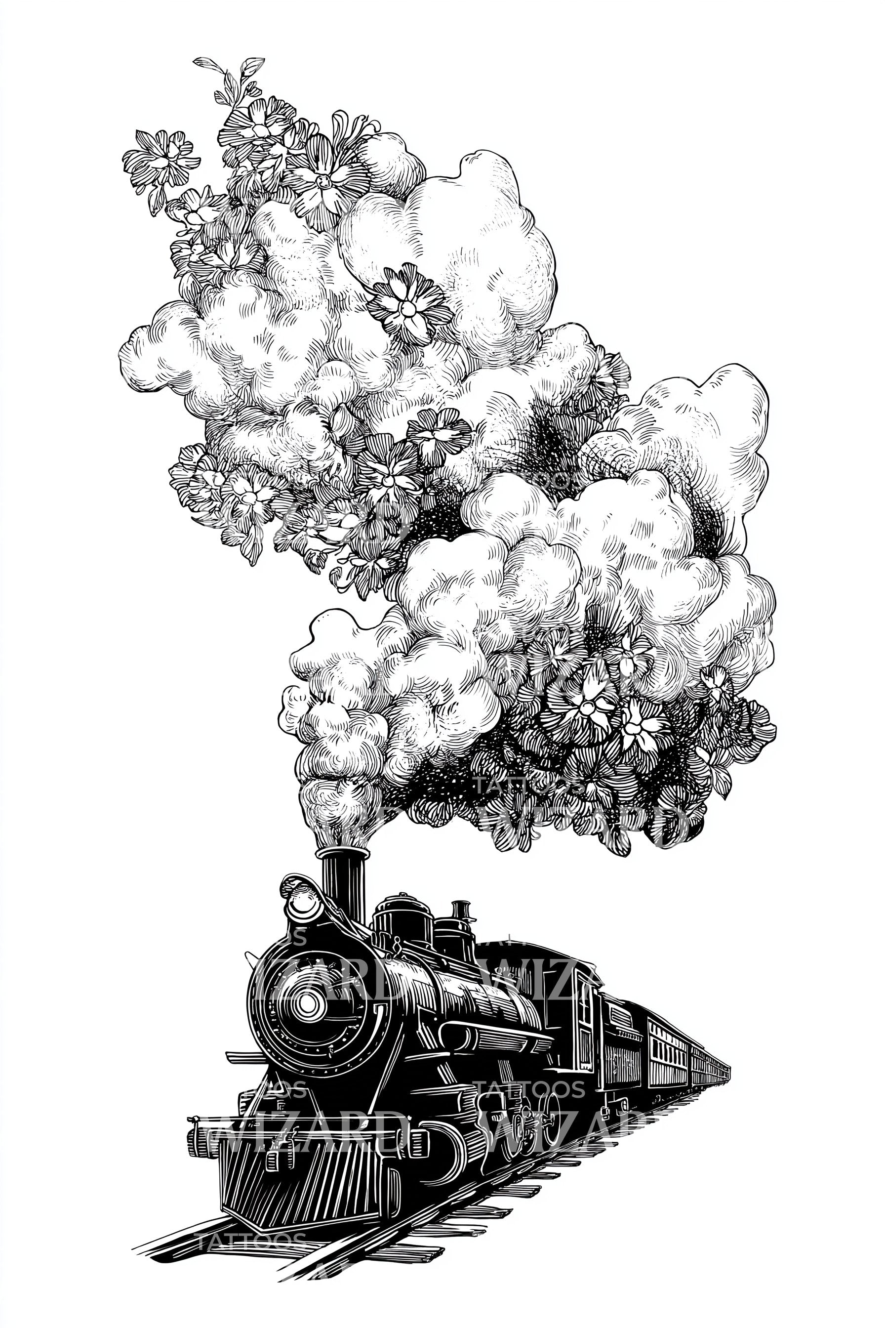 唤起复古怀旧感,这款纹身设计展现了一列充满动感的黑灰色蒸汽火车。融合烟雾元素和工业风格,它是对浪漫旅行时代的惊艳致敬。设计巧妙地呈现了迷人的细节、对工艺的执着以及探索之美。