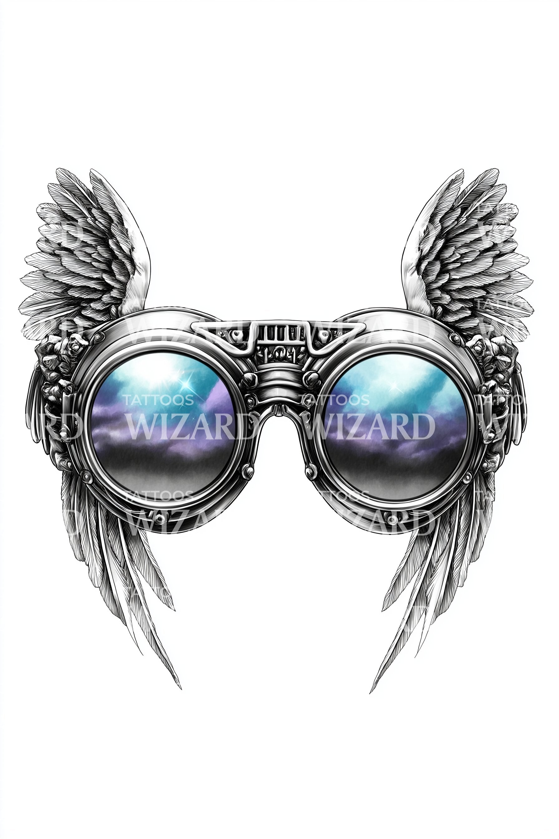 Winged steampunk goggles gleam in neotraditional lines, chrome rivets and delicate feathers framing sky-glass lenses. Gears whisper of retro aviation, invention, and disciplined courage. Reflections of clouded horizons symbolize vision beyond limits. Wearing it feels like ignition of wanderlust, mechanical heart steady, spirit lifting into fearless, purposeful flight.