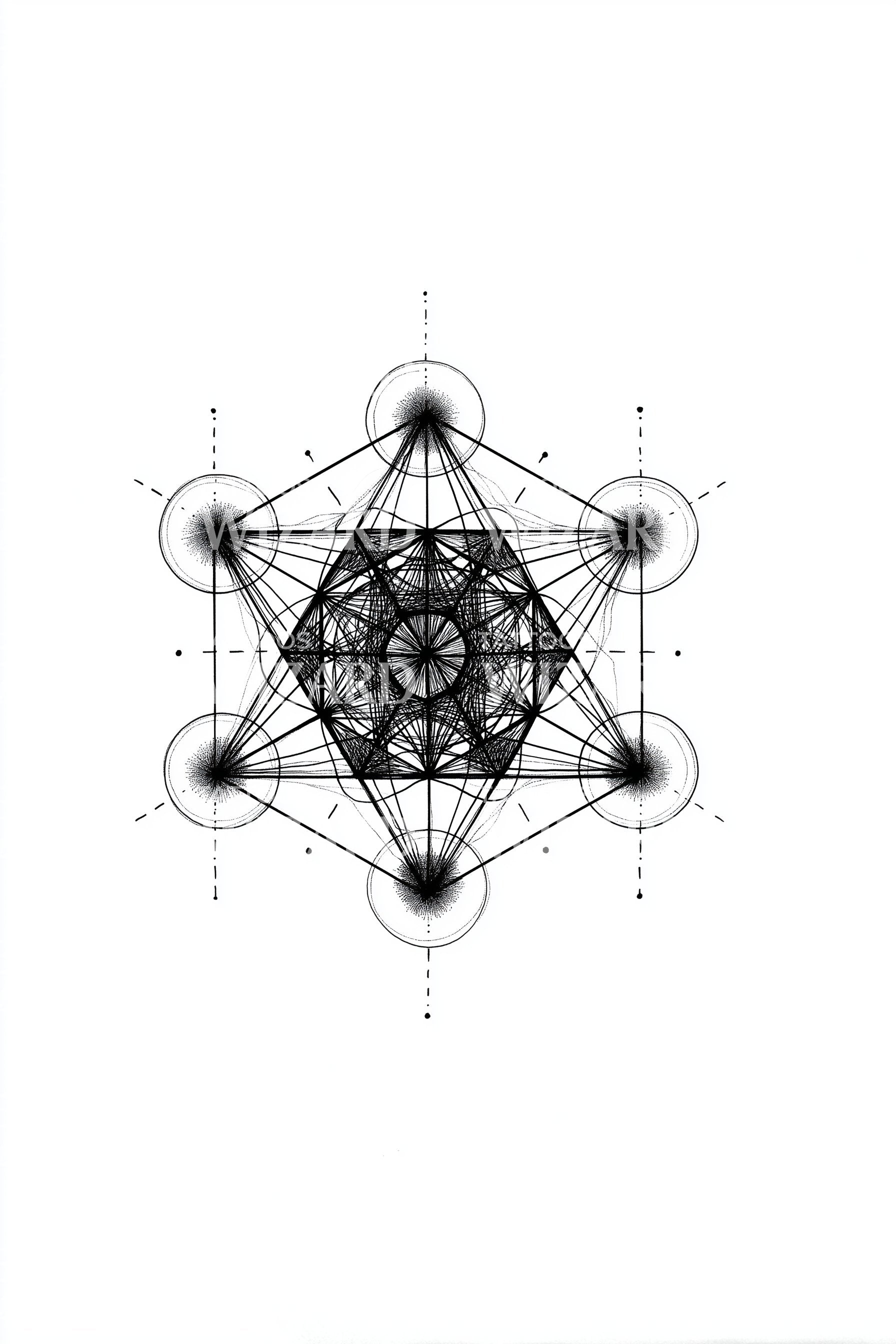 这款精美的纹身设计融合了几何的精湛技艺与空灵的魅力。它象征着星体排列的宇宙之美,独特地将优雅的玫瑰与Metatron的神圣几何图形交织在一起。对于艺术爱好者来说,这一设计是复杂图案的非凡结合,散发出迷人的宇宙氛围。