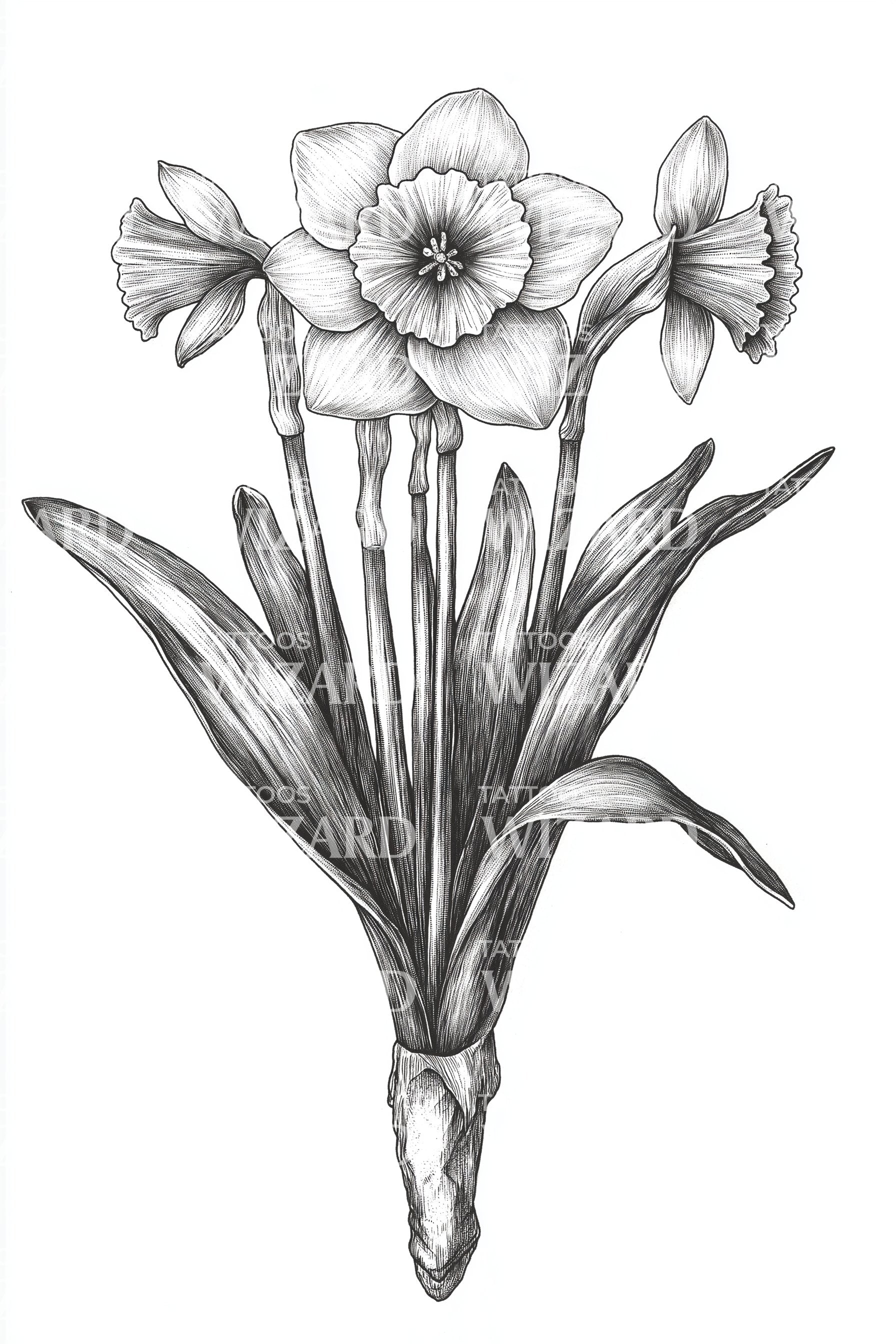 体验我们逼真的水仙花纹身设计,感受大自然的美丽。这组精致的水仙花簇捕捉了盛开花园的植物魅力。茎和花朵的细节处理极为专业,展现了写实纹身的惊人精准。今天就沉浸在自然之美中吧。