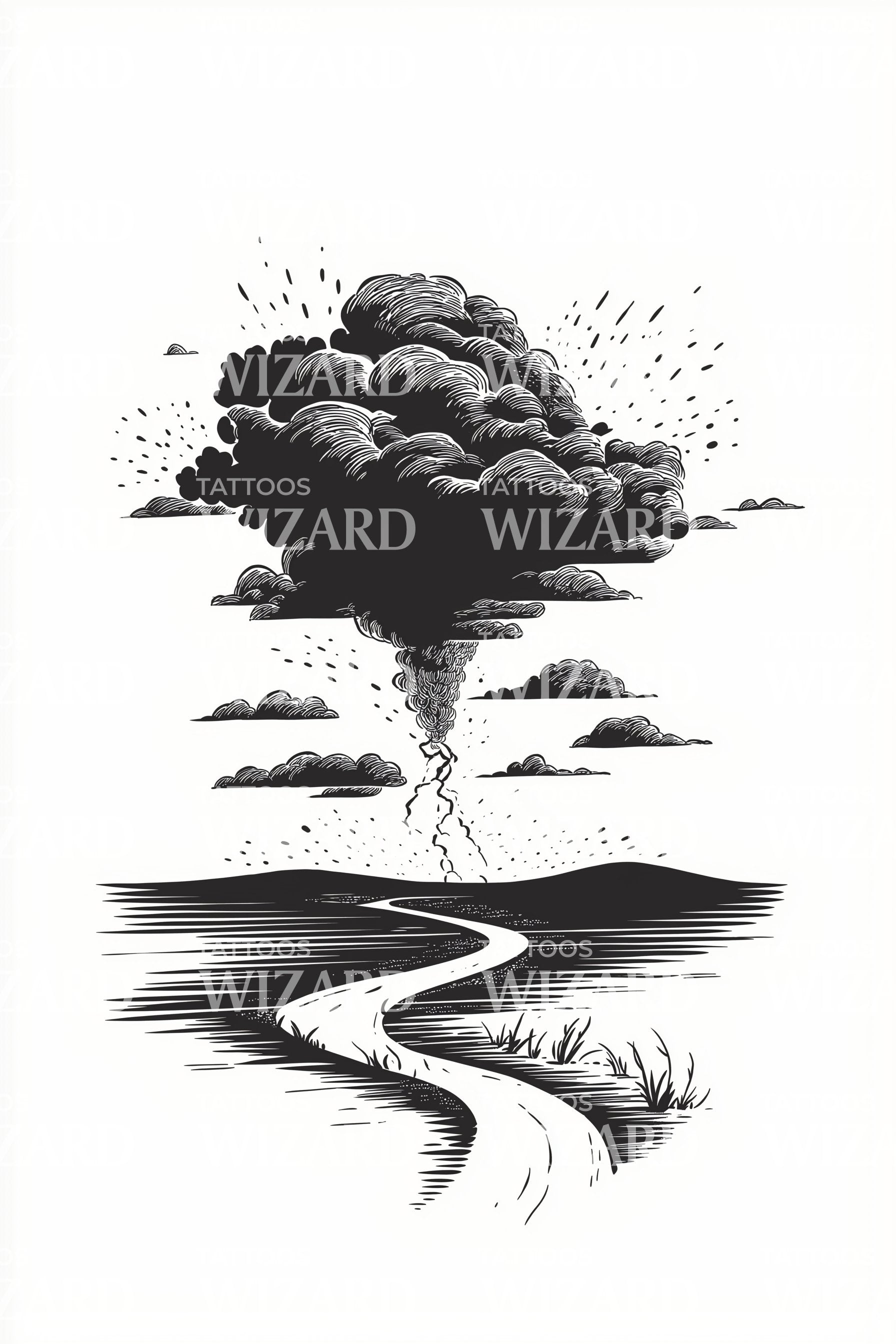 Graphite-dark clouds churn above a sweeping horizon, lightning threading into a winding river that cuts the quiet landscape. In black&grey, contrast breathes movement and calm. Storm speaks of trials, the river of perseverance, the horizon of hope. Wearers feel grounded, resilient, drawn toward renewal, strength, clarity, forward motion.