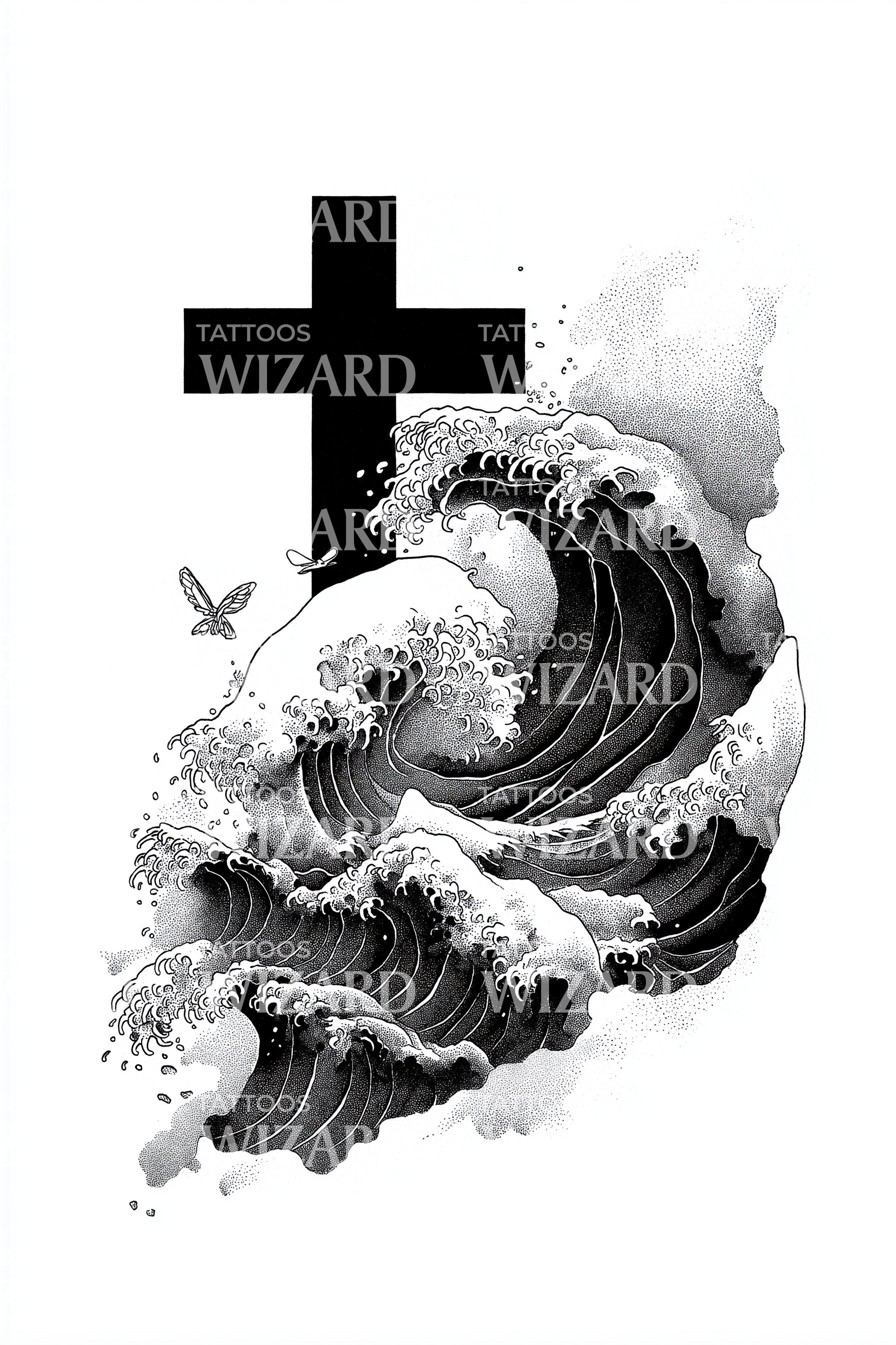 拥抱信仰与能量的戏剧性融合,这款黑灰色纹身设计独具匠心。独特的艺术作品通过强劲的波浪和威严的十字架符号,捕捉风暴的激烈,象征着对逆境的坚韧不拔。非常适合欣赏单色美学和象征性纹身的勇敢者。