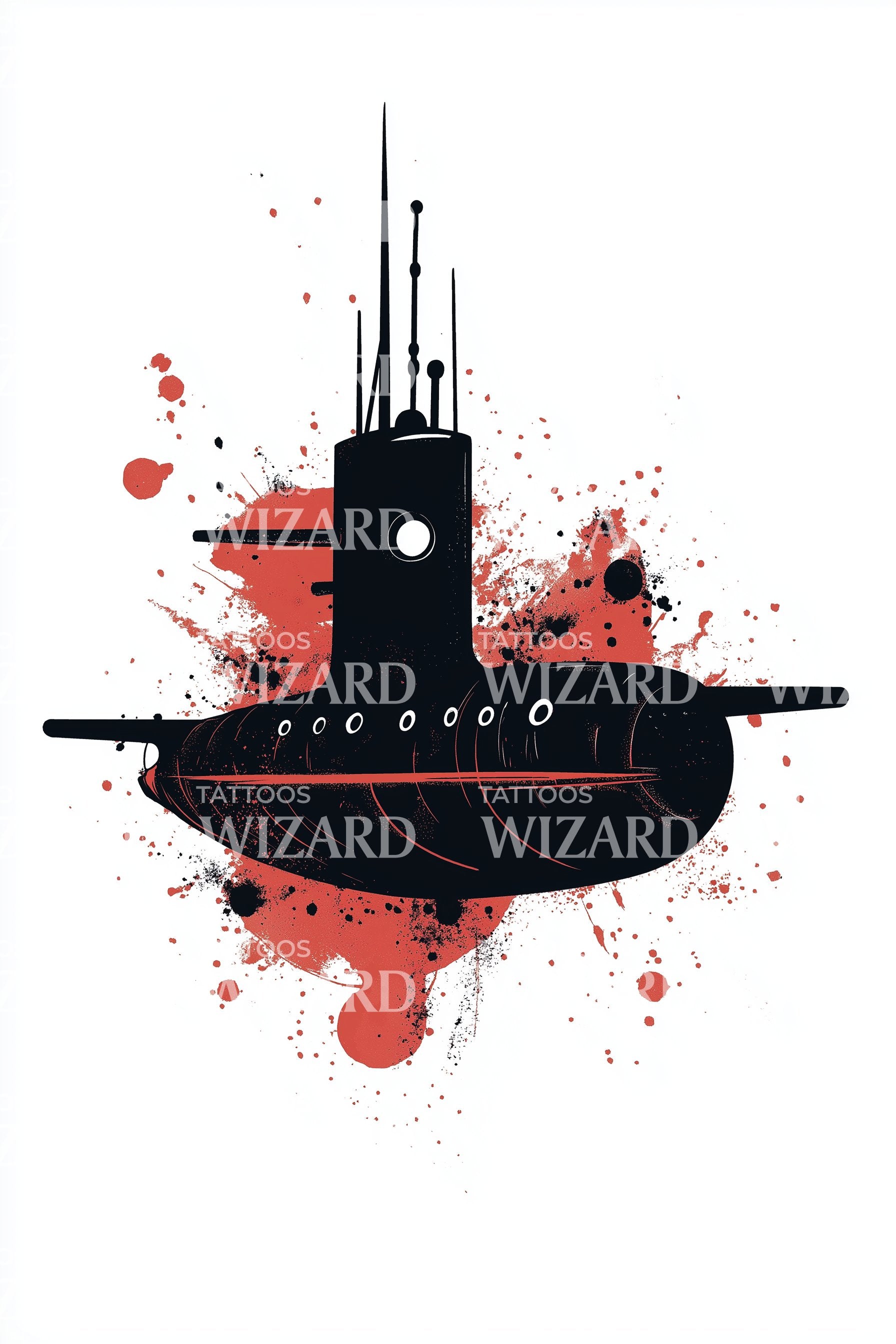 Black minimalist submarine glides across red splashes, crisp portholes and antennas radiating stealth. Symbol of silent courage, Navy heritage, and journeys under pressure, it honors sea guardians and seekers of unknown. Instills calm resolve and covert strength. Ideal placements: forearm flow, calf silhouette, ribs secrecy, upper back balance.