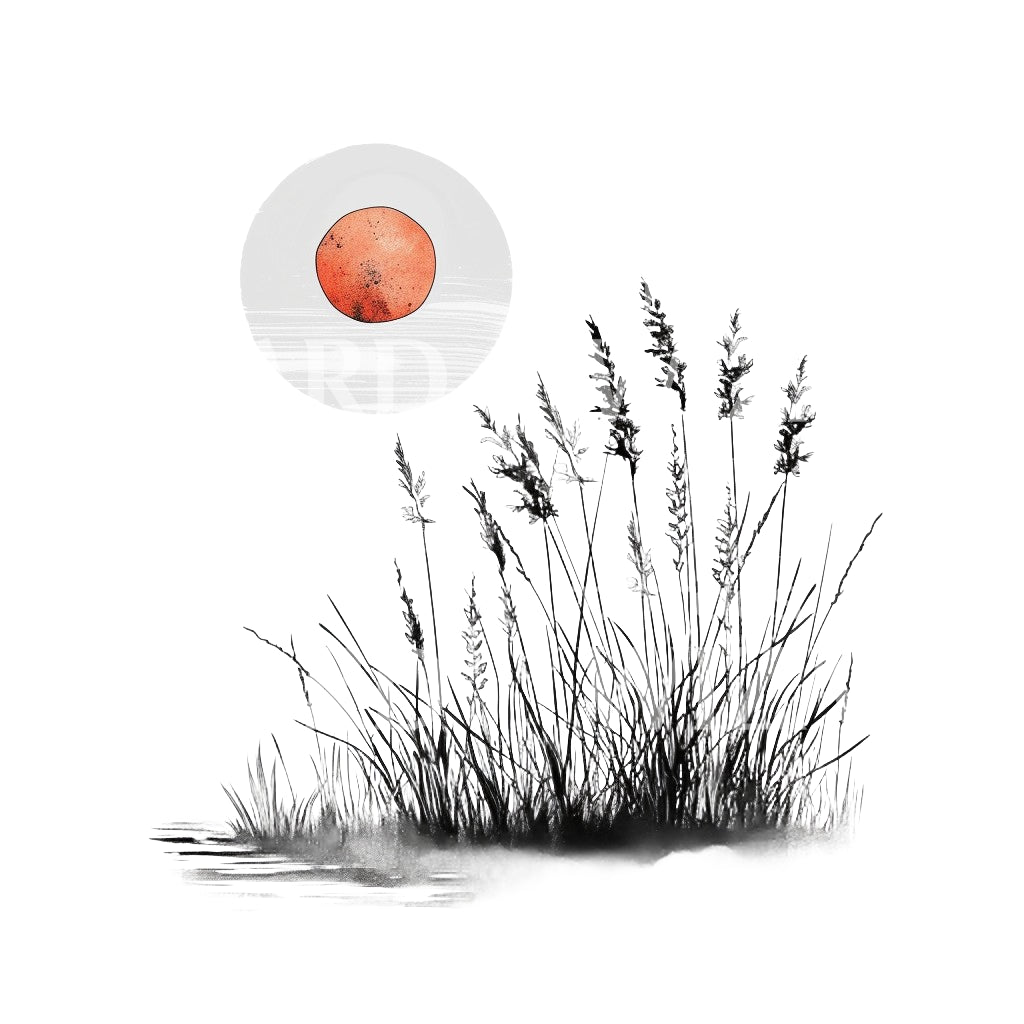 沉浸在夏季月光下的宁静中,这款极简主义纹身设计展现了满月和灿烂太阳在宁静湖面上的迷人倒影,周围环绕着芦苇和植物。散发出宁静的美感,它完美地捕捉了自然迷人场景在抽象极简主义中的魅力。
