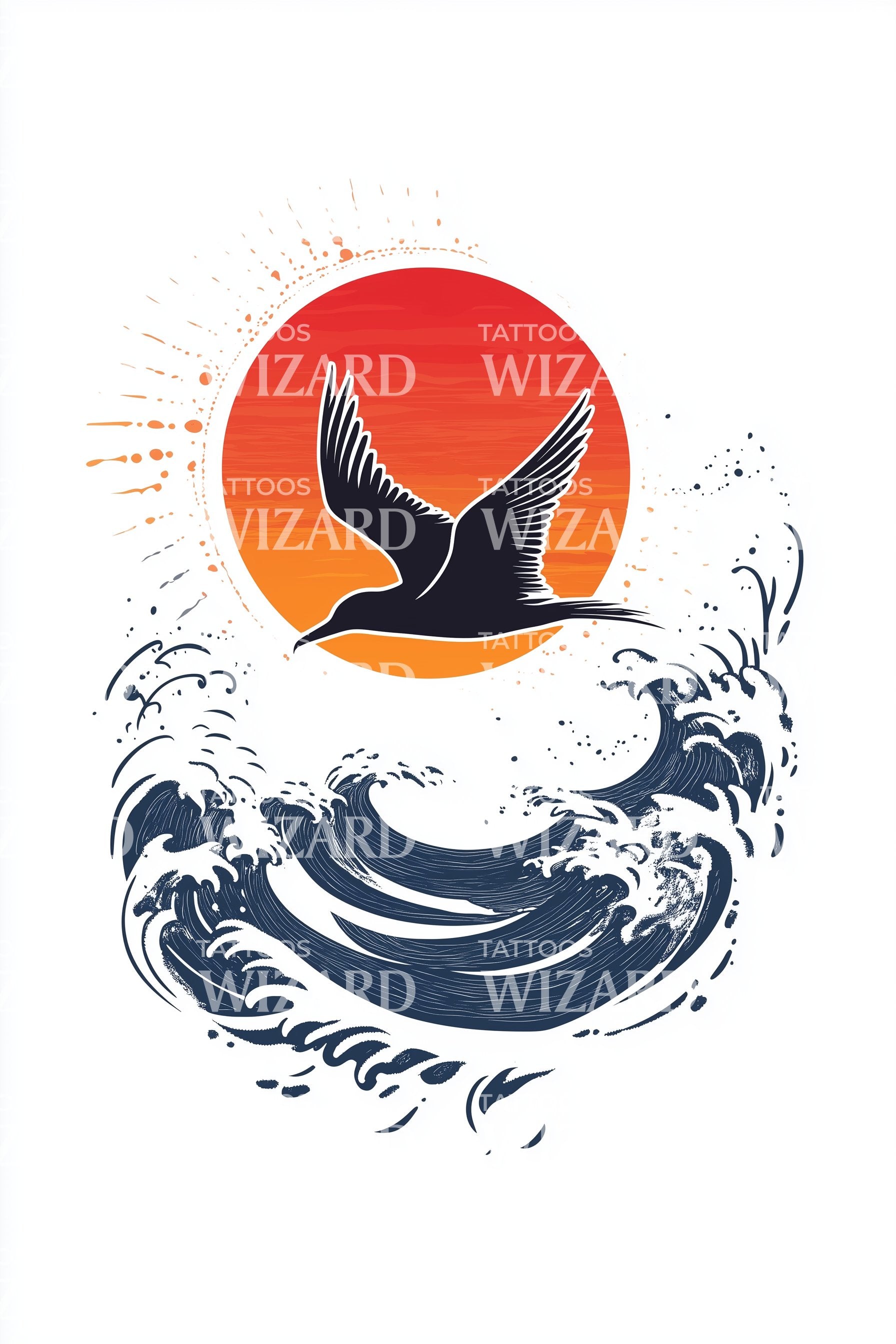这款受日本启发的纹身将大胆的旭日与优雅的鸟类、鹤相结合,翱翔于北斋风格的波浪之上。干净的线条与平衡的构图唤起宁静与力量,致敬海洋的节奏和日本永恒的艺术。非常适合前臂、肩膀、背部或胸部,采用黑色墨水或细腻的水彩色调。
