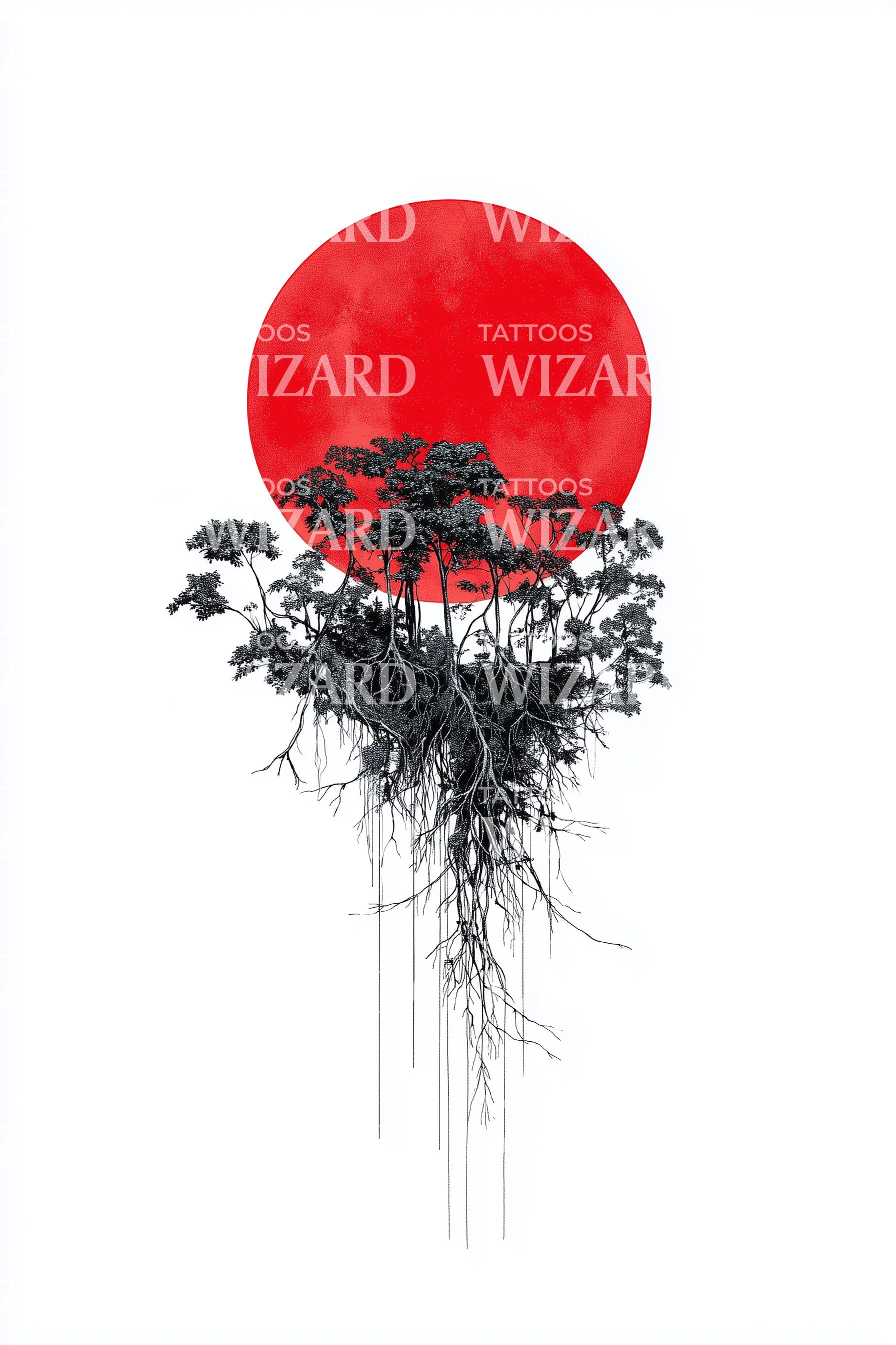 沉浸于旭日之国的水彩纹身设计中。鲜艳的红色墨水捕捉了日本的太阳,交织着茂盛的树木和深深的根系。这件作品完美展现了传统文化与现代艺术诠释的融合。拥抱你的故事,绘于肌肤之上。