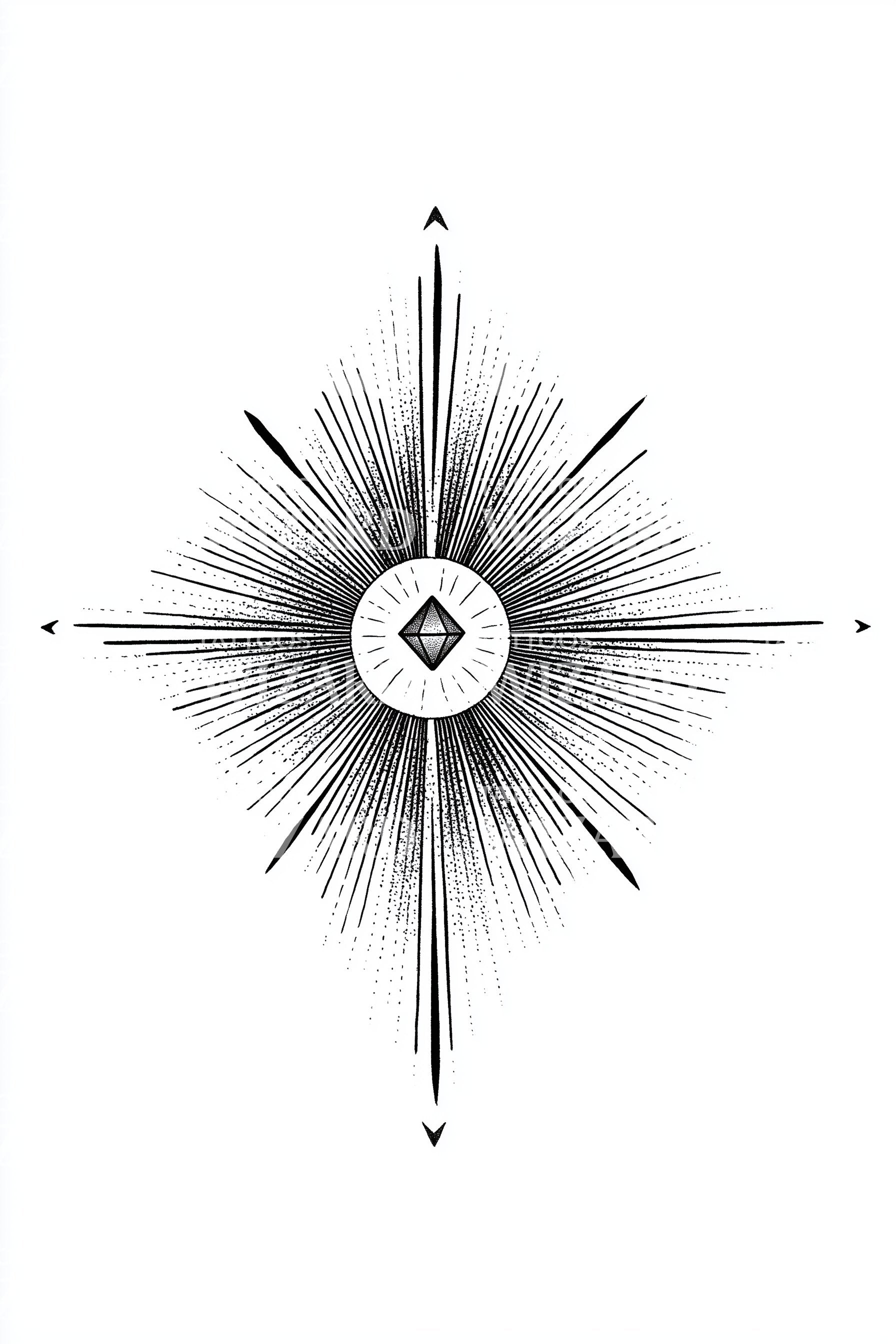 Radiant geometry blooms from a centered circle, a faceted gem cradled within. Needle-fine sunburst rays and crisp compass points create a symmetrical ornament that feels both celestial and precise. Symbolizing inner worth and steady guide, the design carries clarity, courage, and direction, settling the wearer with luminous calm.