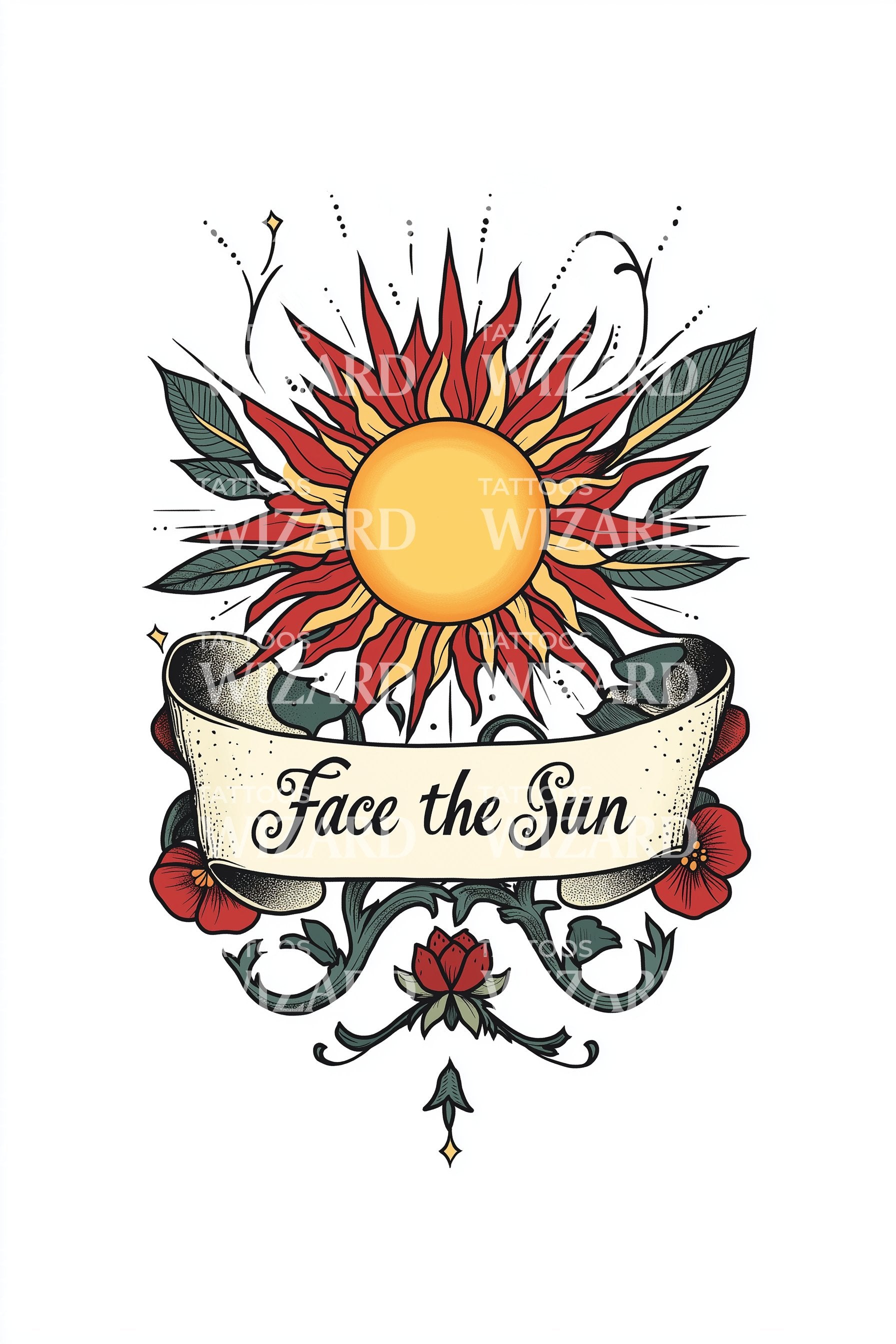 Radiant neotraditional sunflower-sun bursts in amber and scarlet, framed by teal leaves and vintage scrollwork. A classic banner carries Face the Sun in graceful lettering. Symbolizing optimism, growth, and steadfast resilience, this piece feels like morning on skin, warming courage, guiding attention toward brighter paths and blooming possibilities.