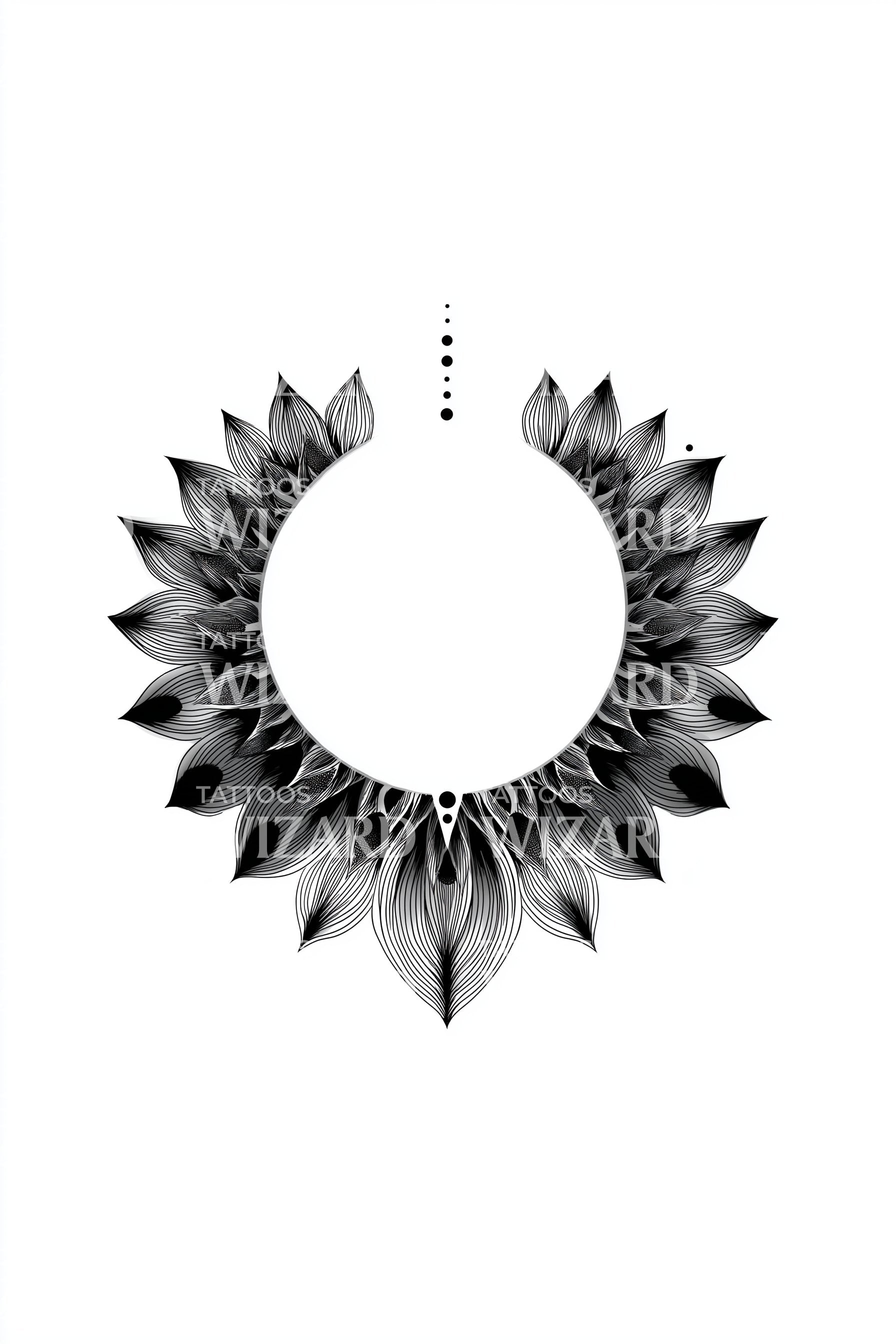 Radiant mandala sunray encircles an open circle, layered petals etched in fine lines and velvety shadow, crowned by rising dots. Geometry and ornament form a protective halo, symbolizing renewal, balance, and inner fire. Wearing it feels like carrying a quiet sunrise at the heart, steady, sovereign, beautifully centered.