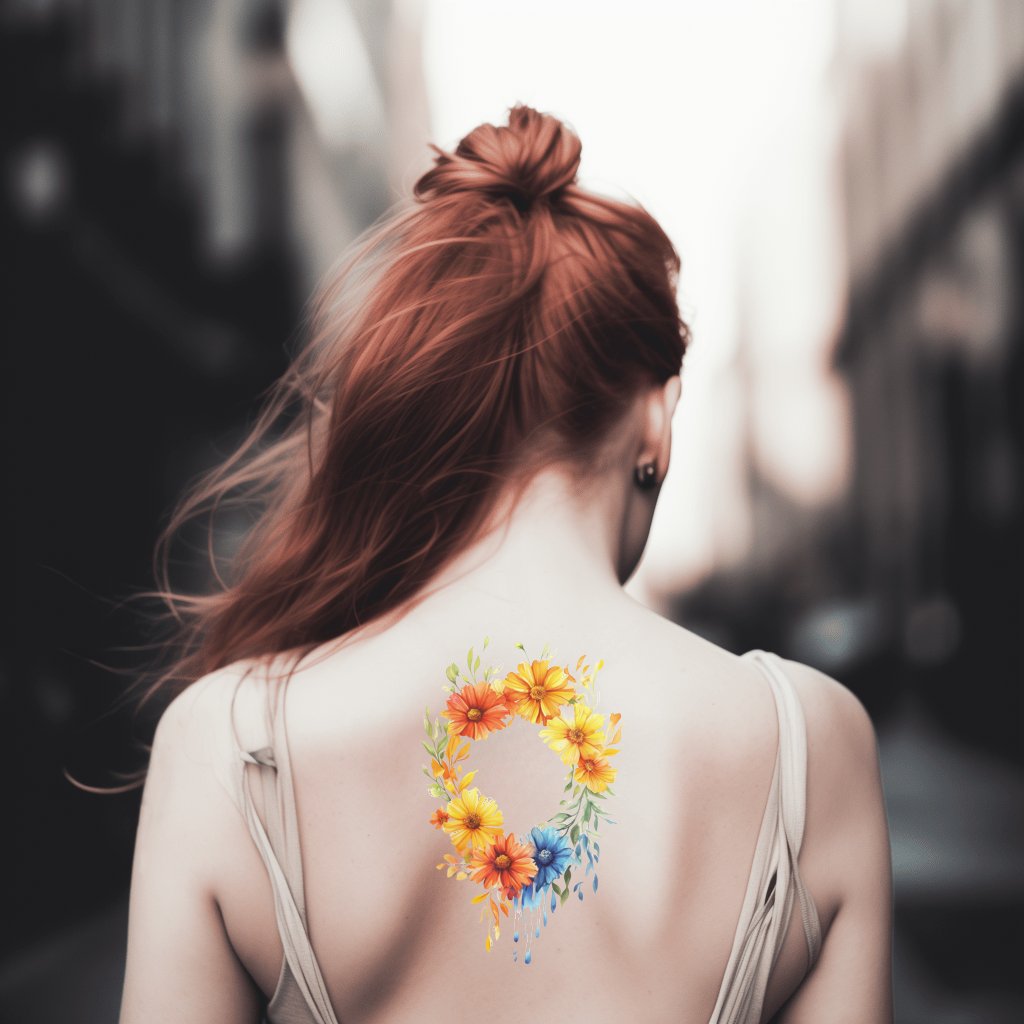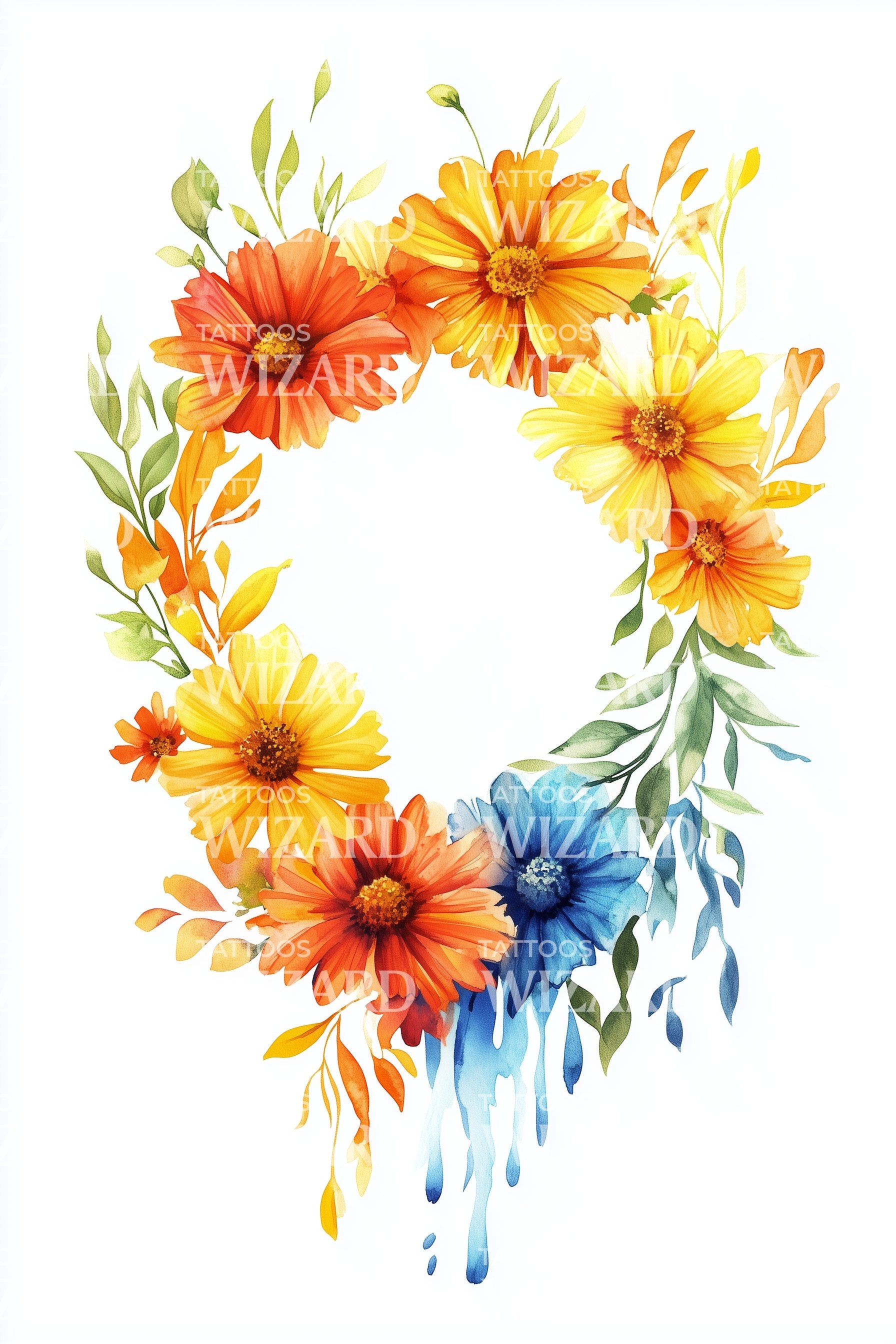沉浸于这款充满活力的水彩纹身设计的温暖魅力中。它精巧地将盛开的花卉景象与宁静的日落美景交织在一起,并点缀着一丝光环。这件惊艳的作品完美捕捉了大自然最迷人元素的和谐融合。