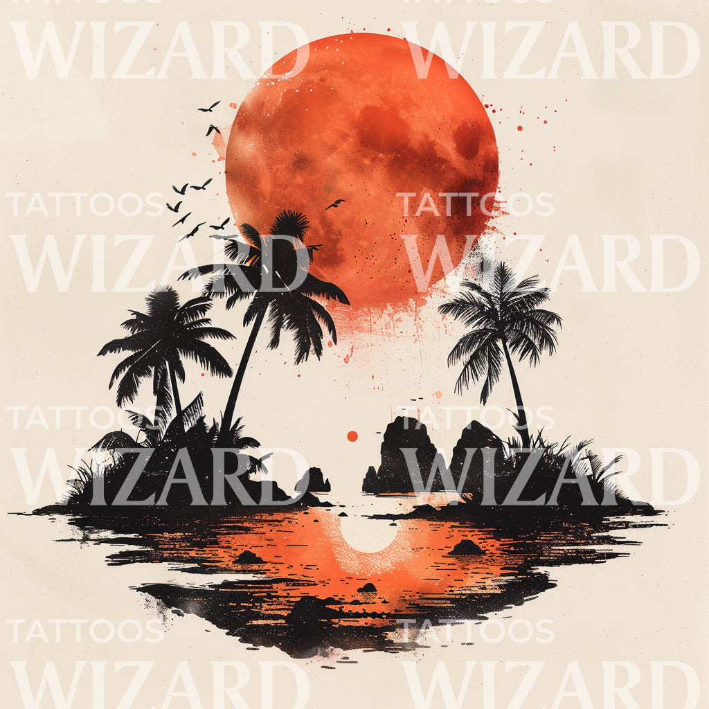 沉浸在夏威夷的美丽中,这款插图纹身设计生动地展现了迷人的岛屿、坚固的岩石和郁郁葱葱的棕榈树,与令人惊叹的日出或日落相映成趣。宁静的海浪增添了一丝宁静,完美地体现了海洋迷人的本质。