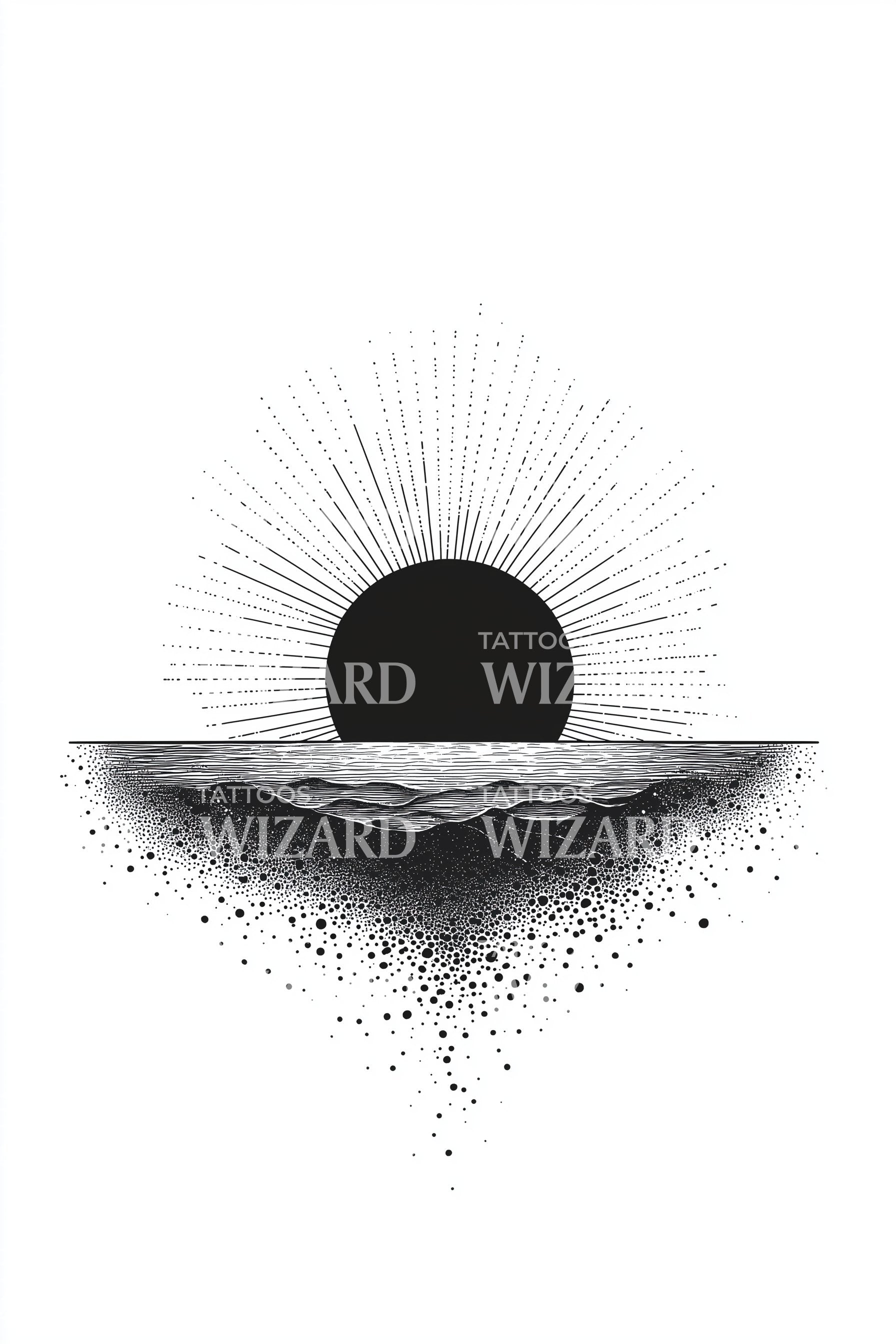 Blackwork horizon holds a bold sun sinking into etched waves, rays fanning in delicate lines and drifting dots. A solstice captured in ink, honoring cycles, endings that promise return, and water’s patient strength. Worn on skin, it feels like tide-breath calm, steady renewal, and luminous coastal quiet within.
