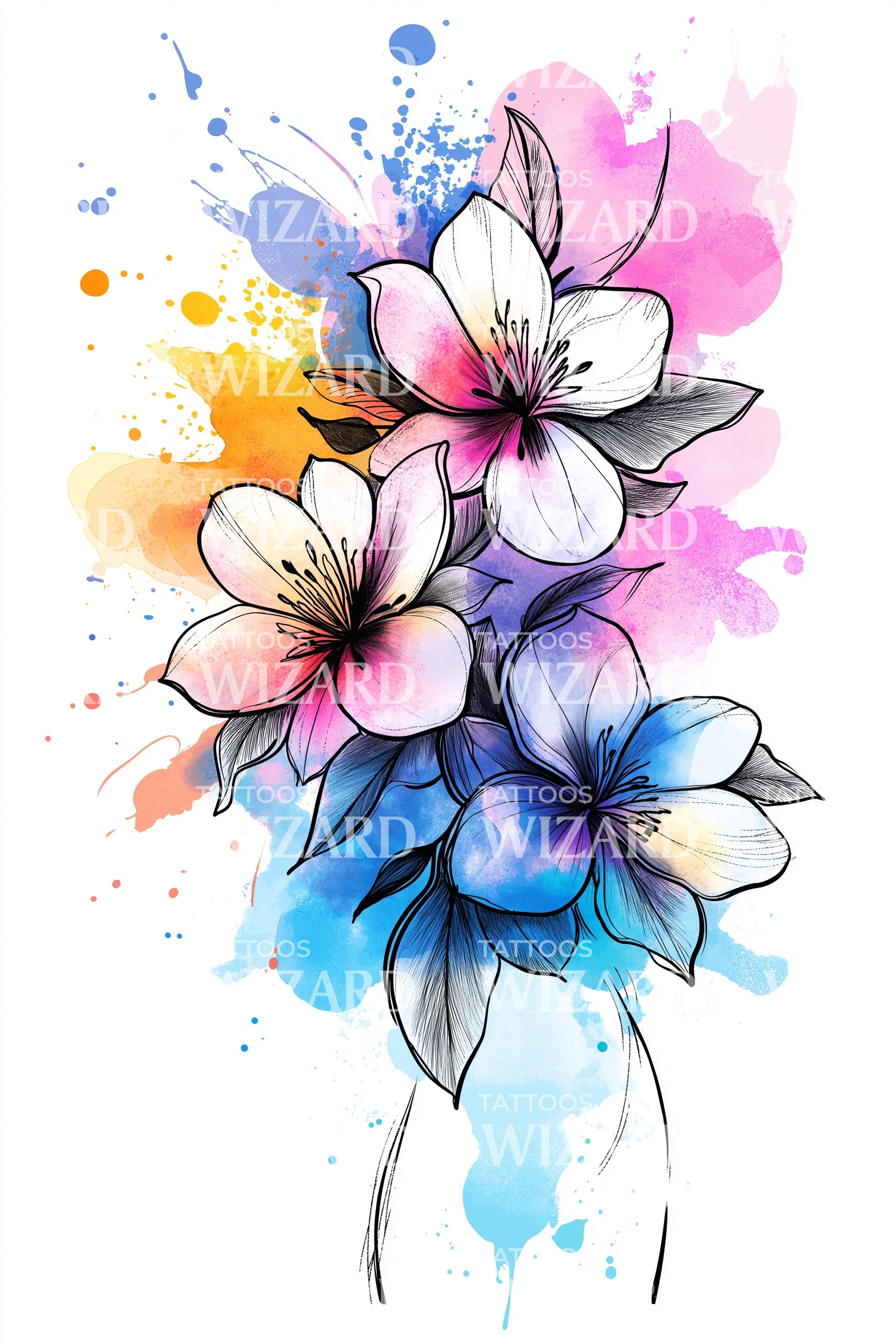 让您的肌肤沉浸在这款水彩鸡蛋花纹身的绚丽色彩中。设计展现了生动的夕阳与盛开的花朵完美融合。非常适合喜爱多彩岛屿风情的人,这款纹身彰显无忧无虑的精神,点缀着鸡蛋花的鲜艳活力!