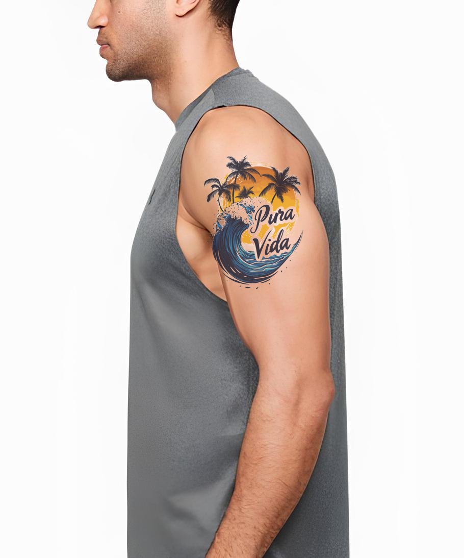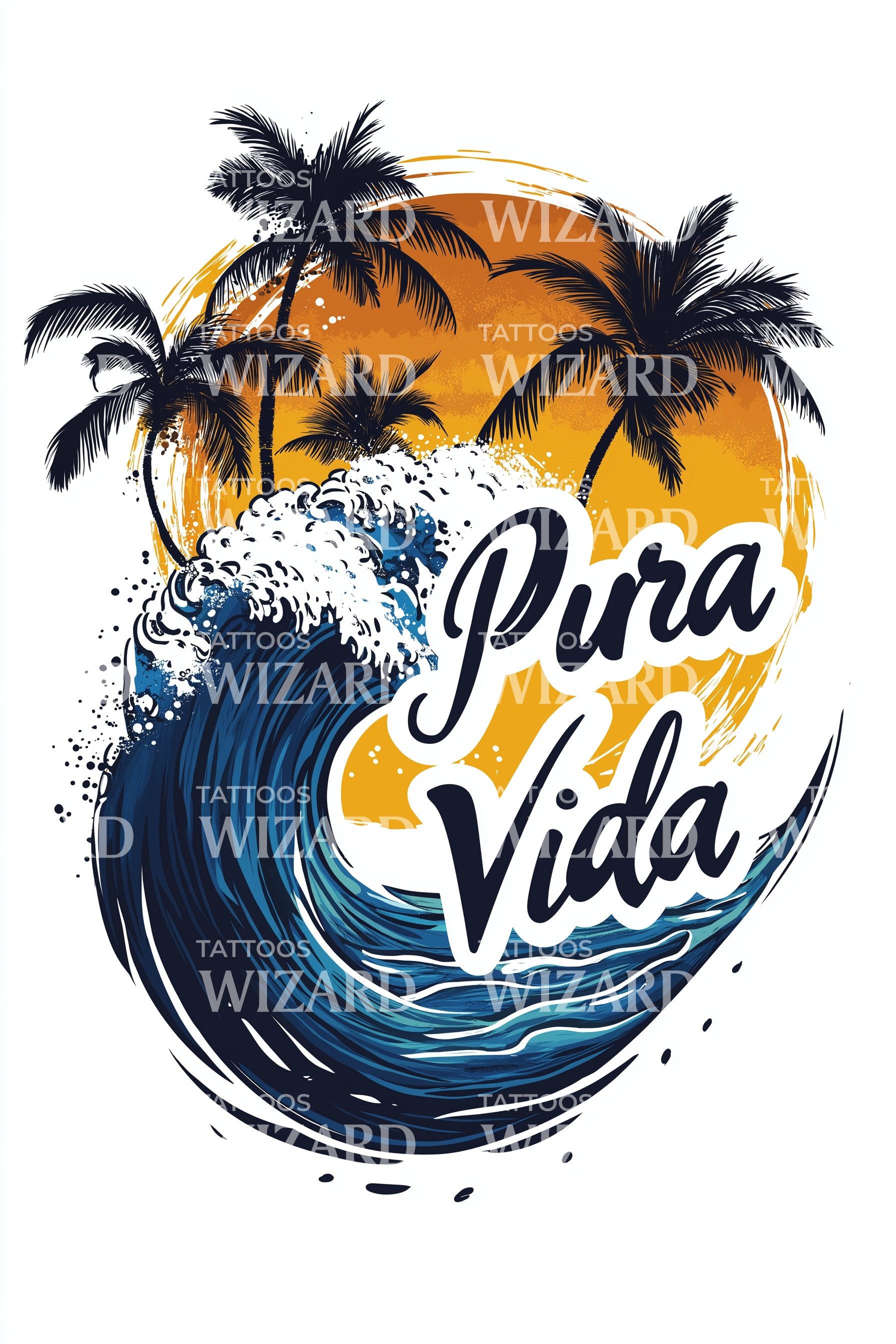 Neotraditional sunburst melts behind inky palms, while a cobalt wave curls forward, lettering whispering Pura Vida. Sunset circle symbolizes renewal and gratitude; palms embody ease; the wave honors courage and flow. Wear it for tropical beach calm, salt-sprayed freedom, and a daily reminder to choose luminous simplicity, always.