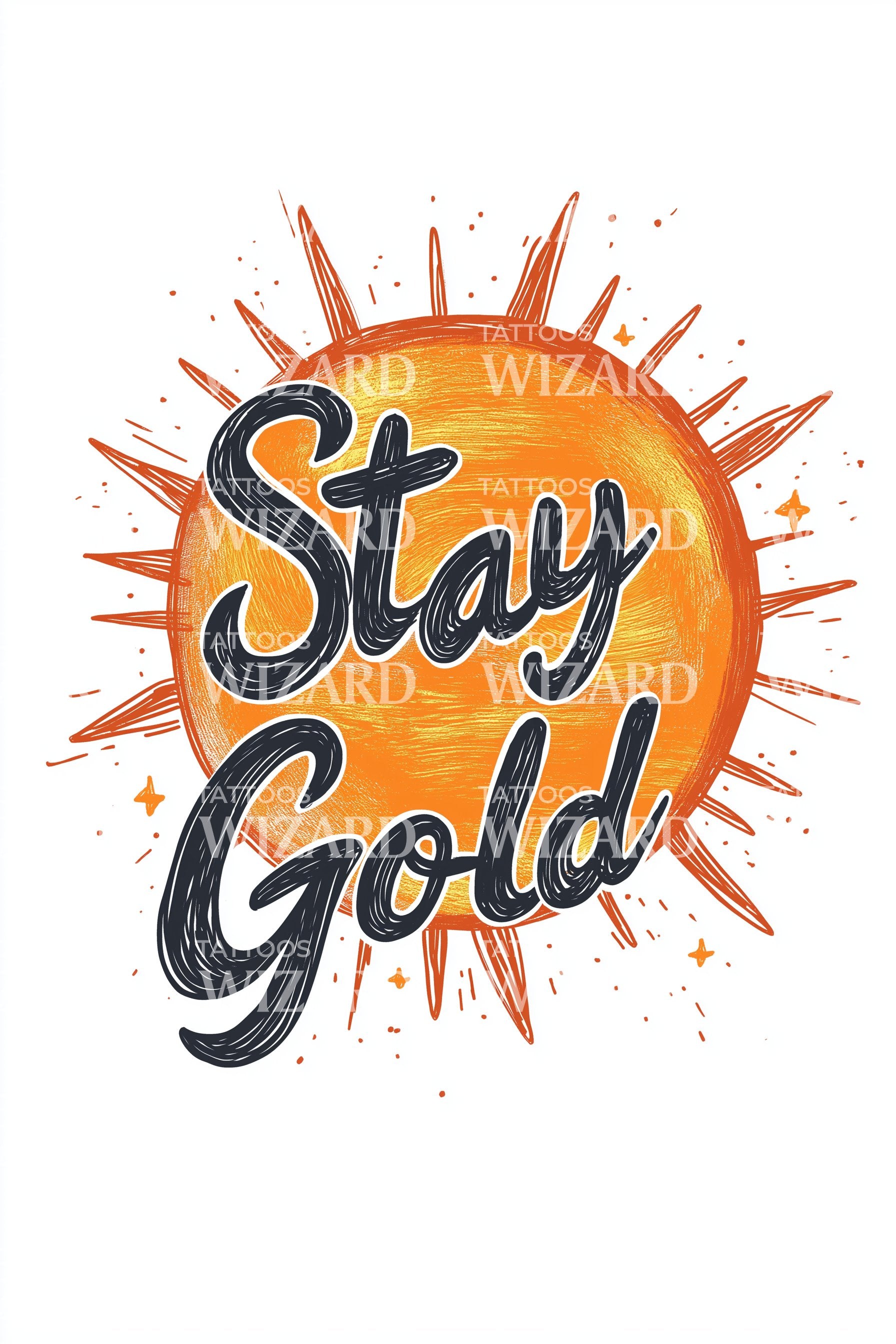 Watercolor sunset orb glows in molten gold, splattered rays cradling bold brush script that reads Stay Gold. Symbolizes constancy, hope, and choosing light. Wears like a warm reminder of optimism. Ideal placements: forearm for visibility; upper chest for heart-close promise; shoulder blade for radiance; calf for stride-forward energy.
