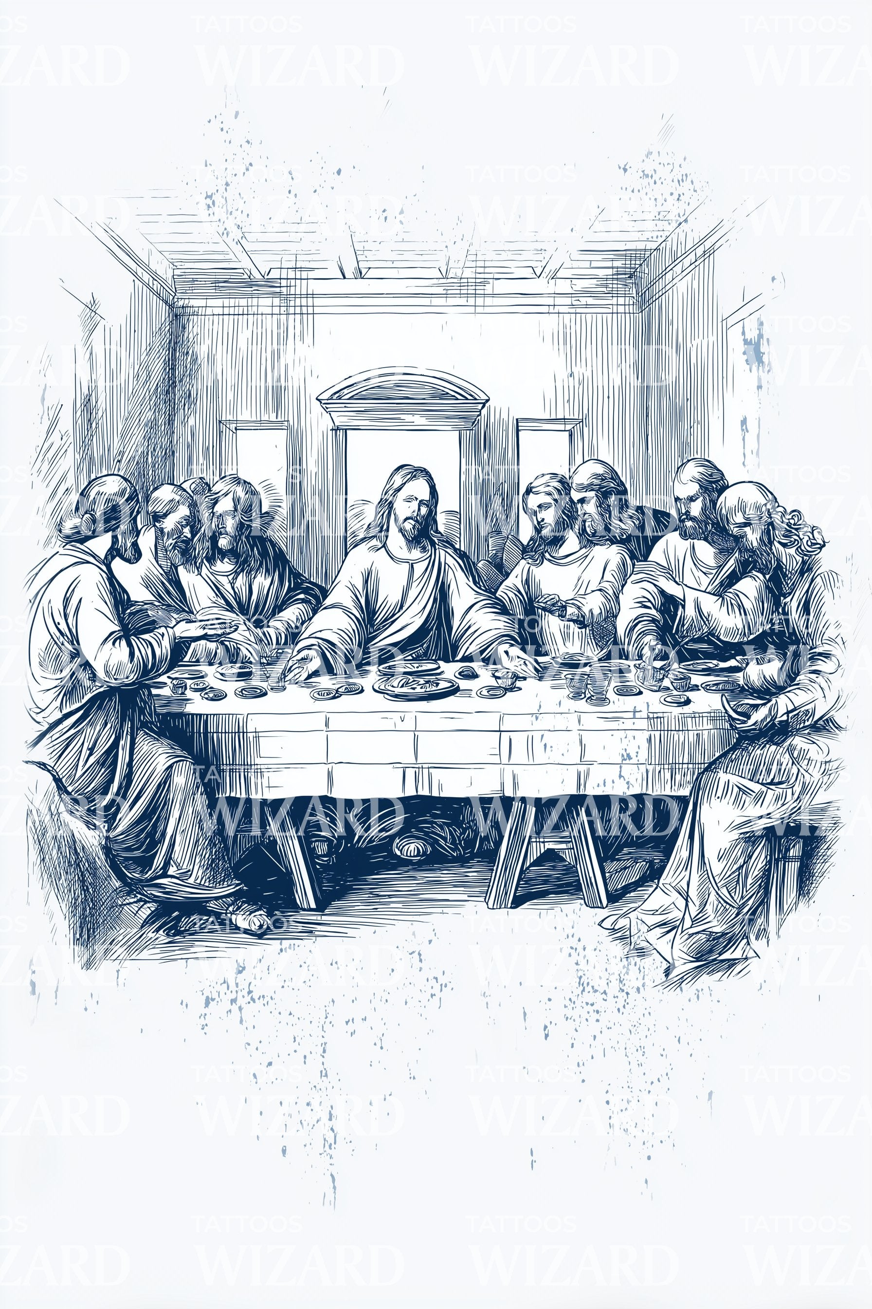 这款经典素描纹身设计以醒目的蓝色展现了使徒们著名的晚餐场景。沉浸于用一段历史诠释的素描作品来标记你的身体的传统——经典图像与现代风格的完美融合。