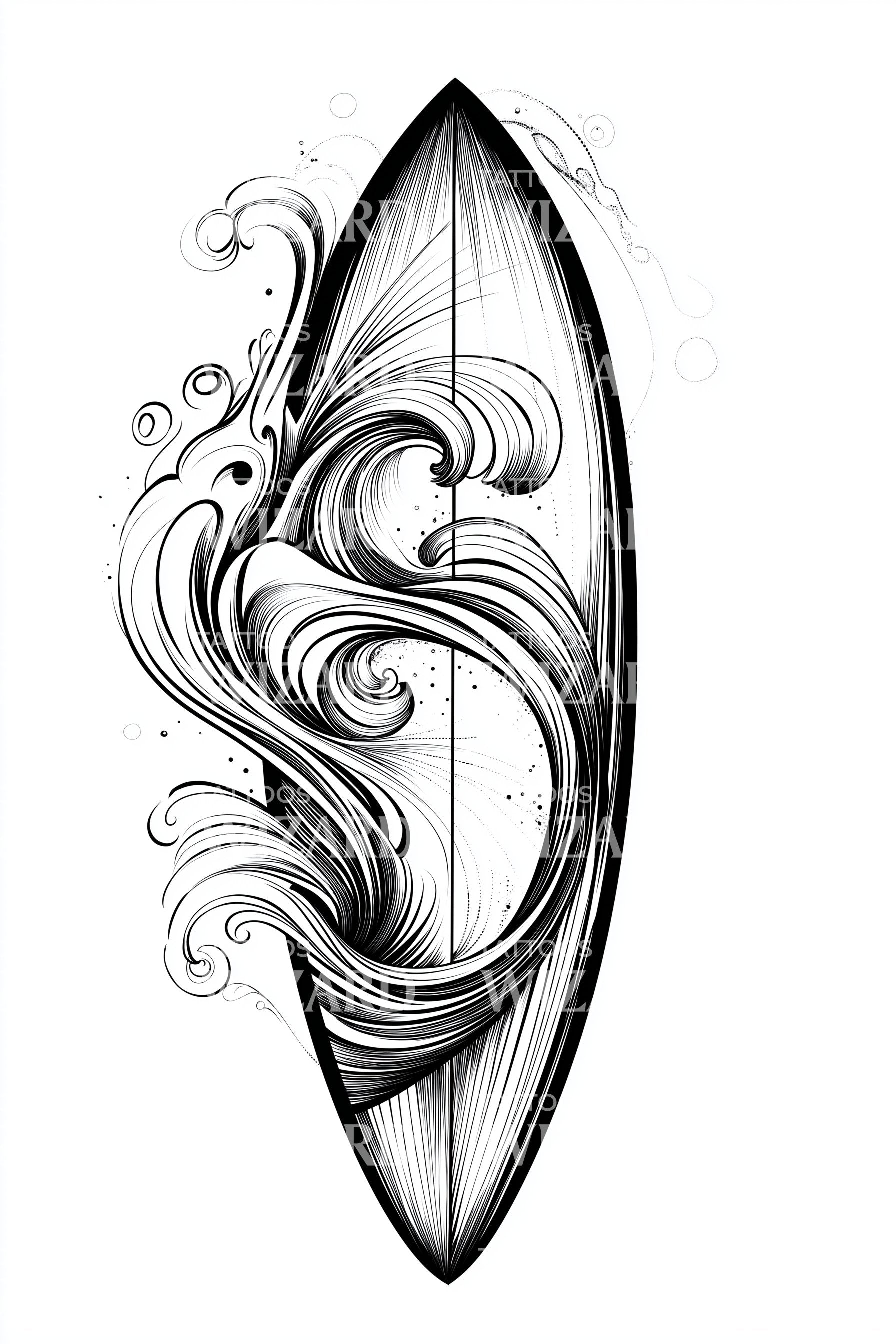 Sleek surfboard silhouette cradled in Art Nouveau swirls and ornamental filigree waves, stippled spray whispering motion. Symbolizes surrender and mastery, the tide’s eternal return, courage riding change. Wears like calm momentum and salt-born freedom. Ideal placements: forearm or calf for vertical flow; ribcage or spine for elegant curvature.