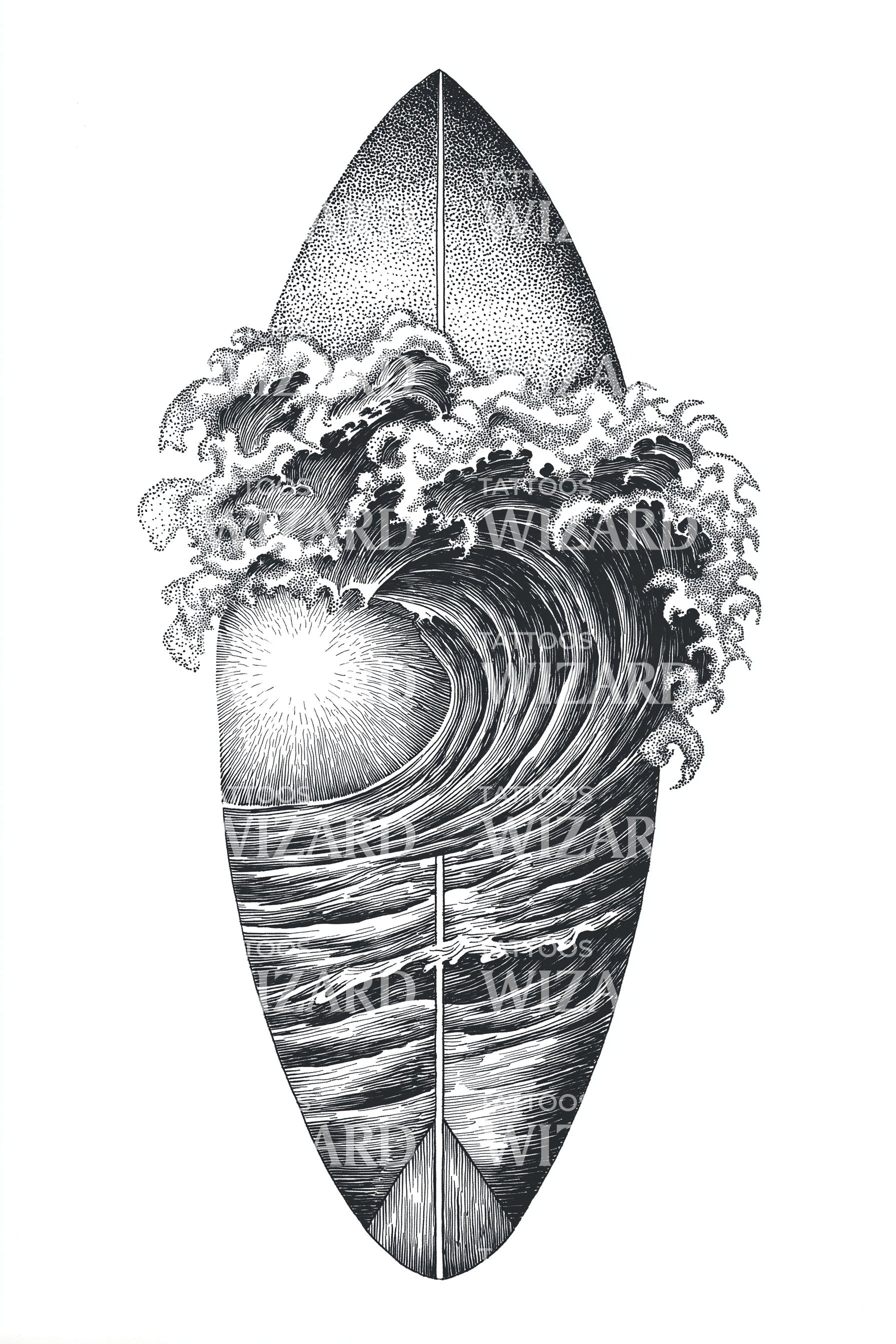 Microrealist surfboard vignette: fine-line wave curling inside board silhouette, stippled sun igniting the ocean, sea froth rendered in dotwork. Symbolizes surrender and courage, the endless ride between chaos and calm. Wears like saltwind confidence and beach-born stillness. Ideal placements: forearm, calf, spine, ribs for vertical flow with the board’s elongated shape.