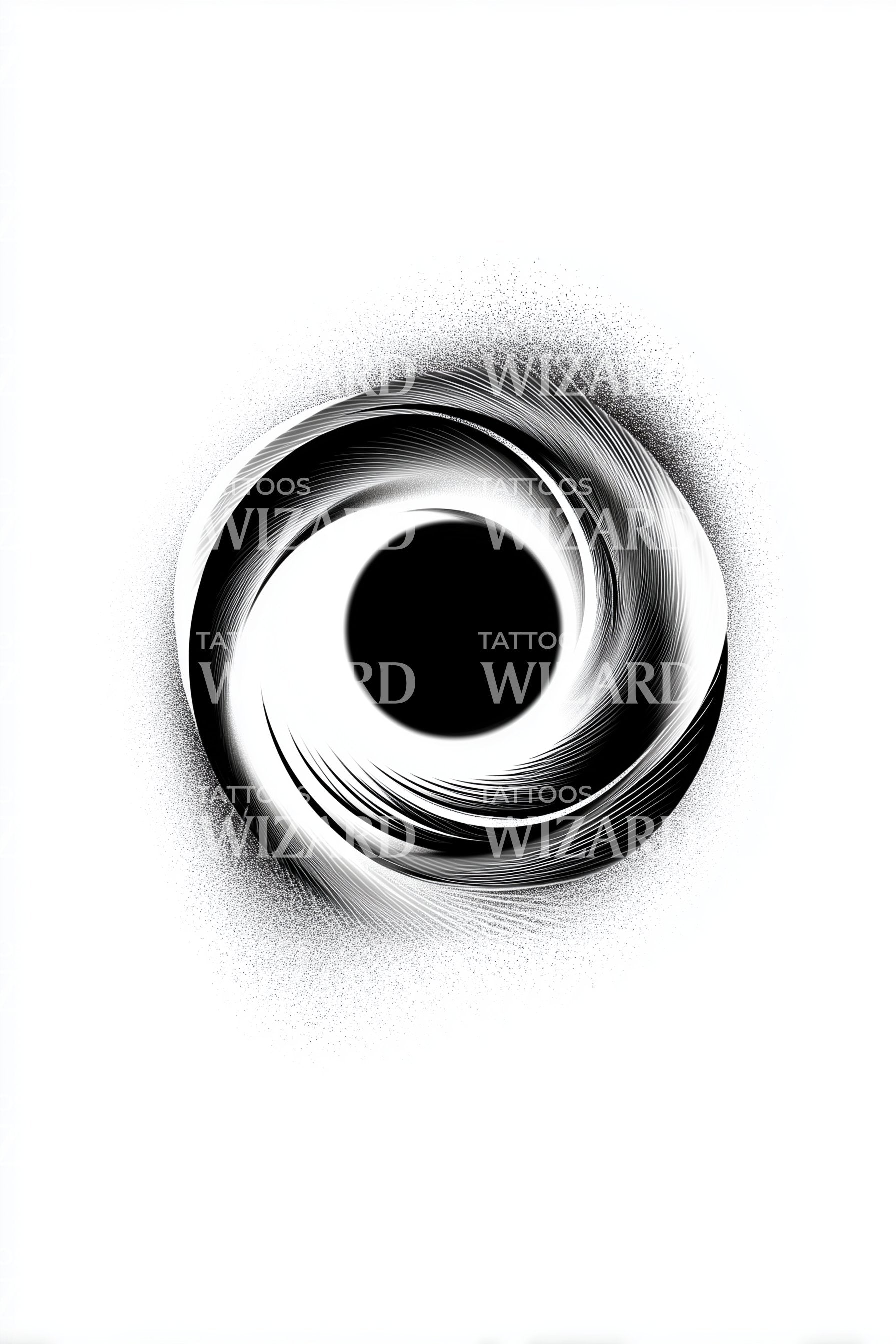 A compact blackwork vortex circles a midnight singularity, with razor-fine swirls and a soft stippled halo suggesting orbit and relentless spin. The blackhole symbolizes gravity of purpose, drawing distractions away. Worn daily, it feels centering, sleek, and quietly fierce, a reminder to move with momentum and uncompromising focus.