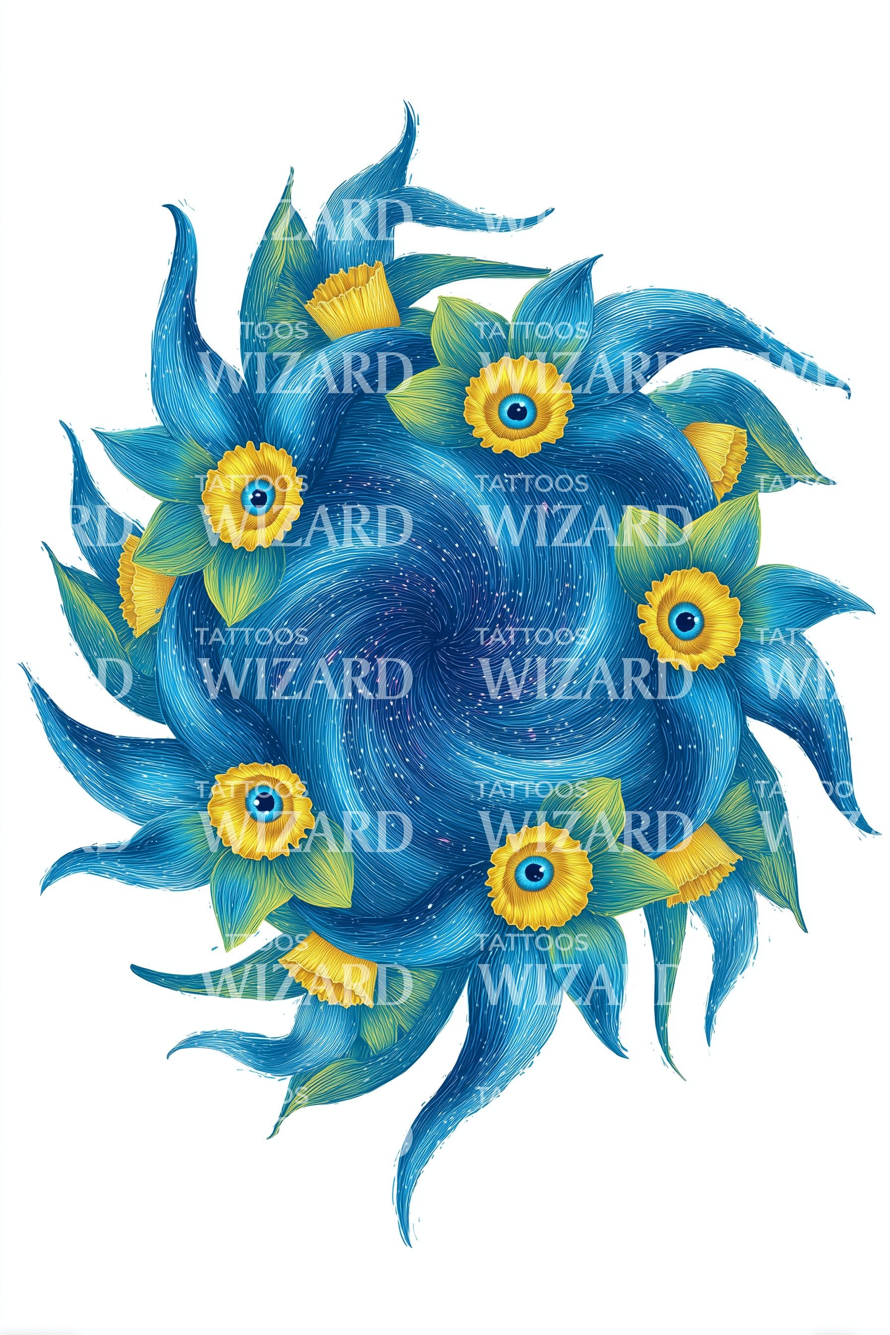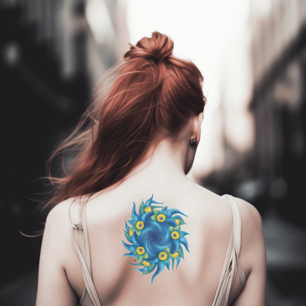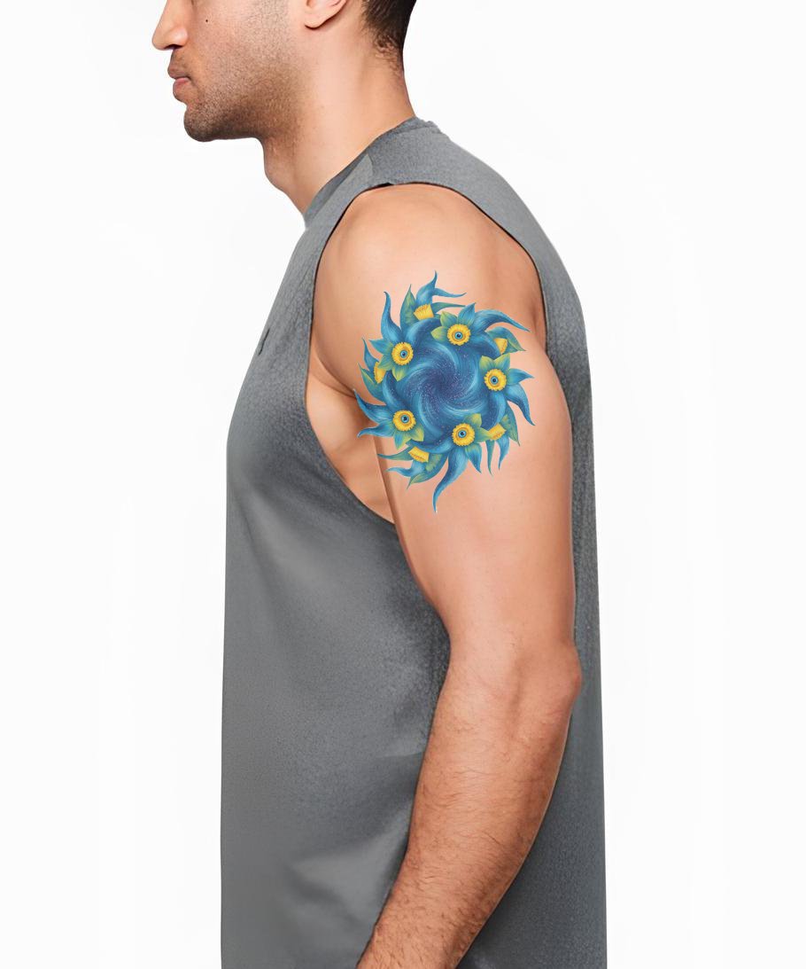 拥抱你的宇宙能量,这款天体纹身设计以鲜艳的蓝色抽象漩涡为主,中心是一轮光芒四射的太阳,生动地象征着力量与活力。这款独特的纹身体现了宇宙永不停息的活力,完美适合自信且富有冒险精神的你!