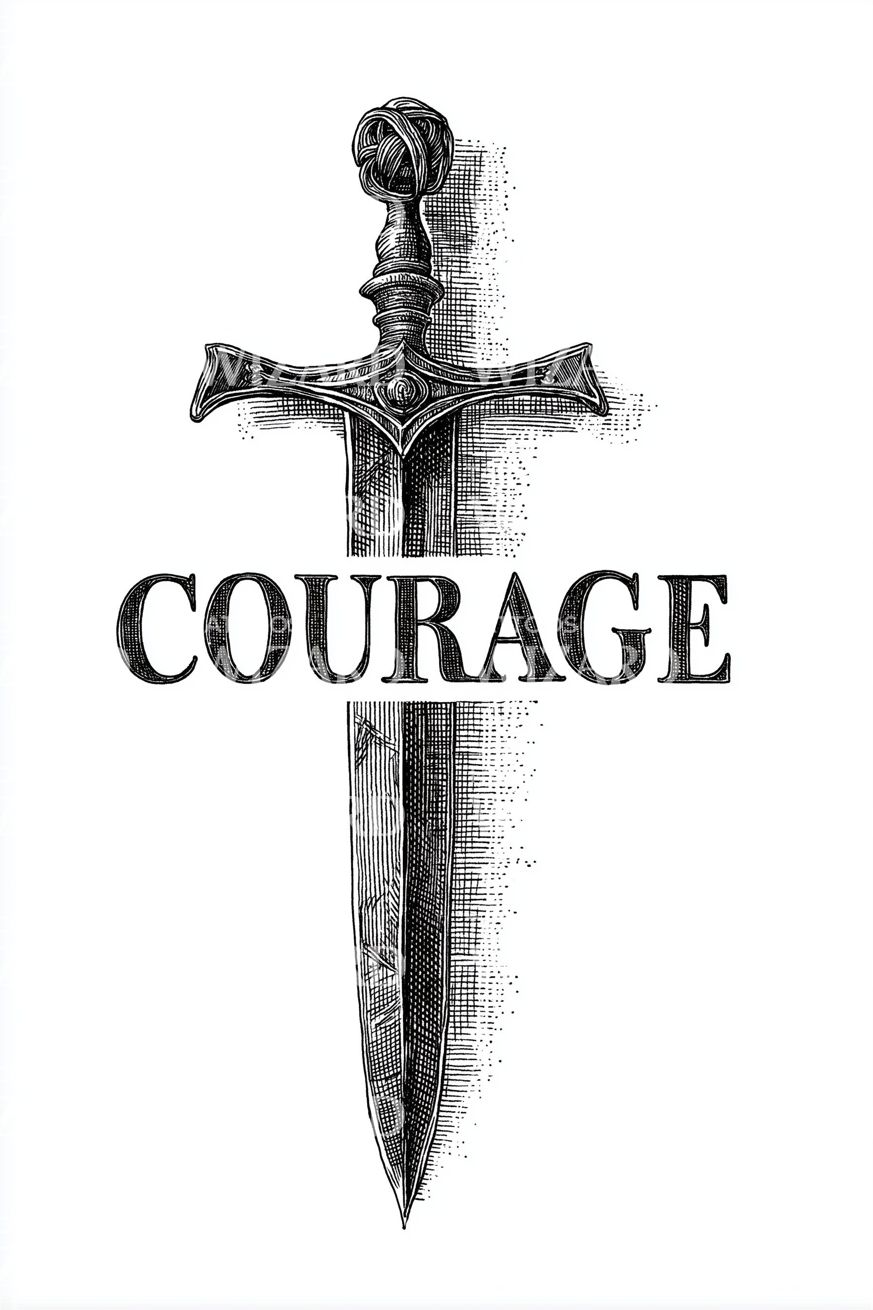 Forged in ink, a medieval sword rises through bold serif lettering, rendered in meticulous blackwork hatching and stipple shadow. Steel becomes emblem and vow, its point marking forward motion while the word COURAGE crowns the spine. Worn on skin, it radiates clarity, resolve, and fearless, disciplined strength.