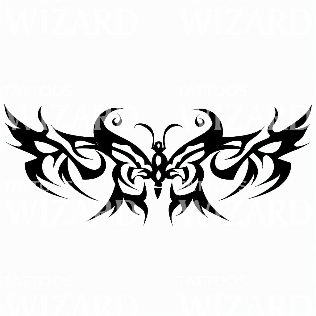 用这个独特的部落纹身设计来拥抱你独特的风格。它以锐利的线条和对称的图案精心细致,灵感来自蝴蝶翅膀的超凡美丽。对于那些欣赏大胆美学的人来说,这个设计完美地将部落传统与自然优雅结合在一起。