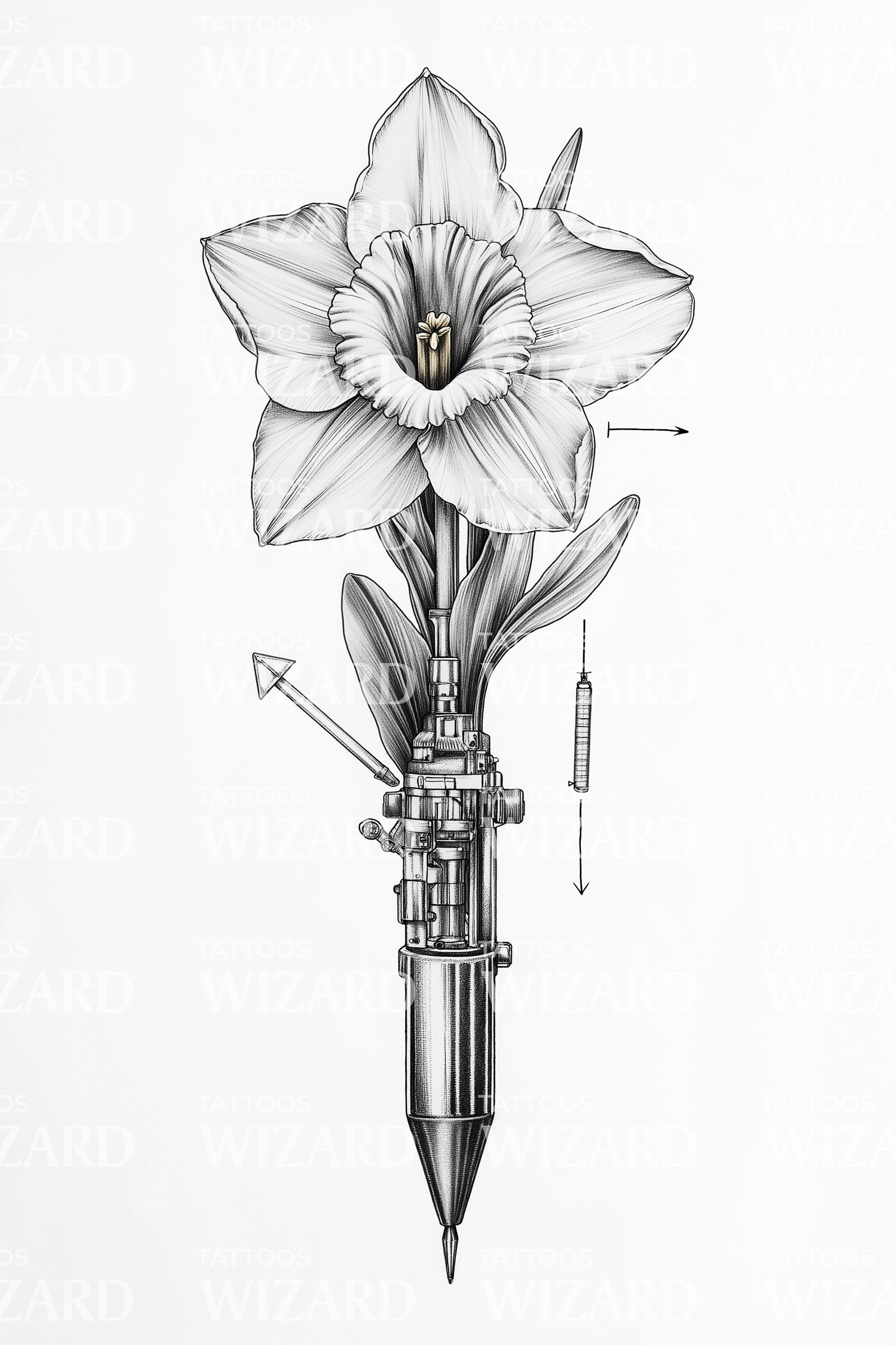 这款插画风格的纹身设计巧妙地融合了百合花的细腻与机械元素的粗犷魅力。注射器作为花茎,为这件简洁的黑灰作品增添了独特的创意。非常适合那些寻求既新颖独特又含蓄优美设计的人士。