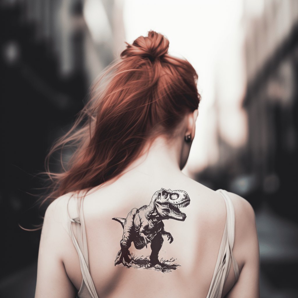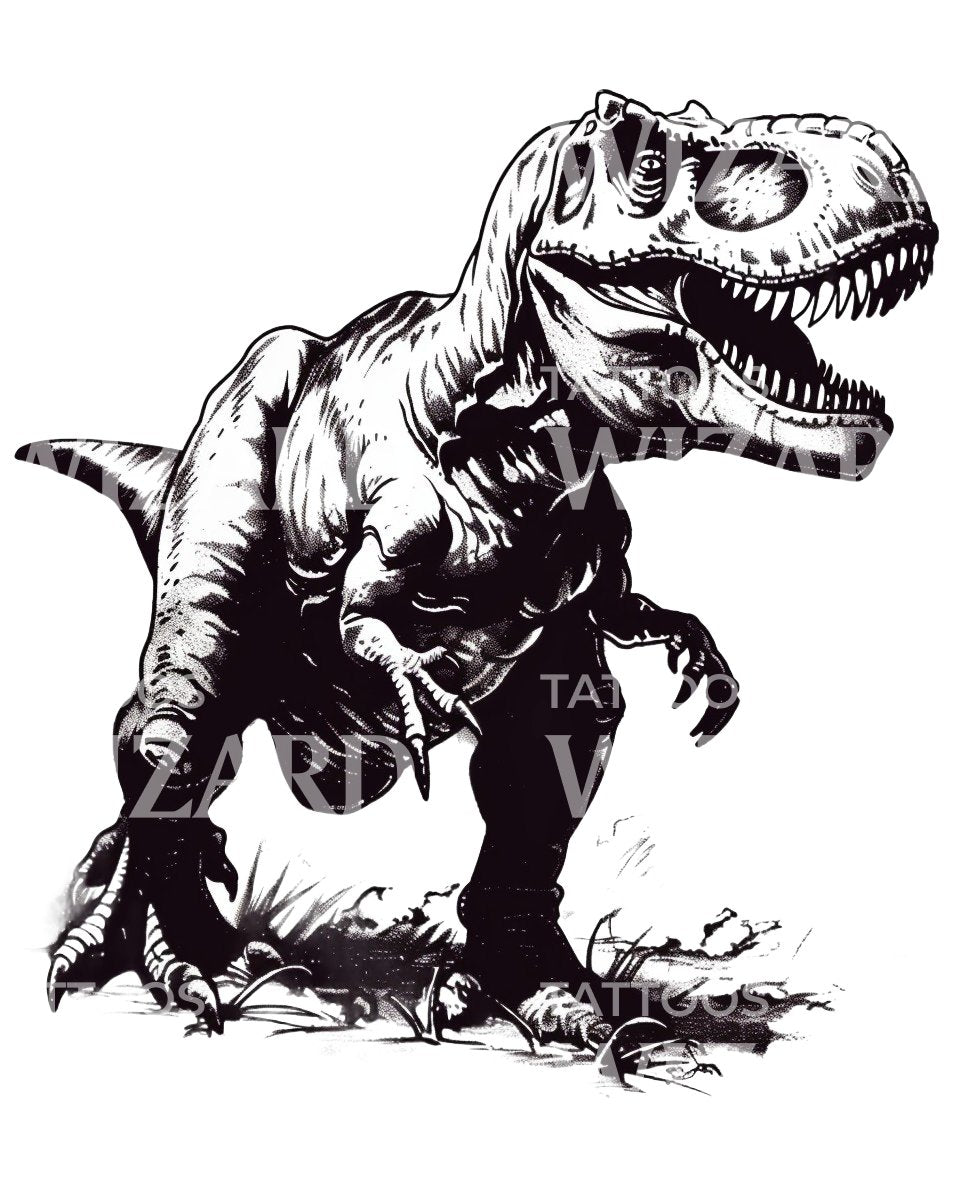 释放你内心的野性,选择这款黑灰色的霸王龙纹身设计。对于恐龙爱好者来说,这款黑色墨水作品捕捉了这些史前巨兽的凶猛与神秘。对于任何希望通过身体艺术做出大胆声明的人来说,这是一个引人注目的选择。