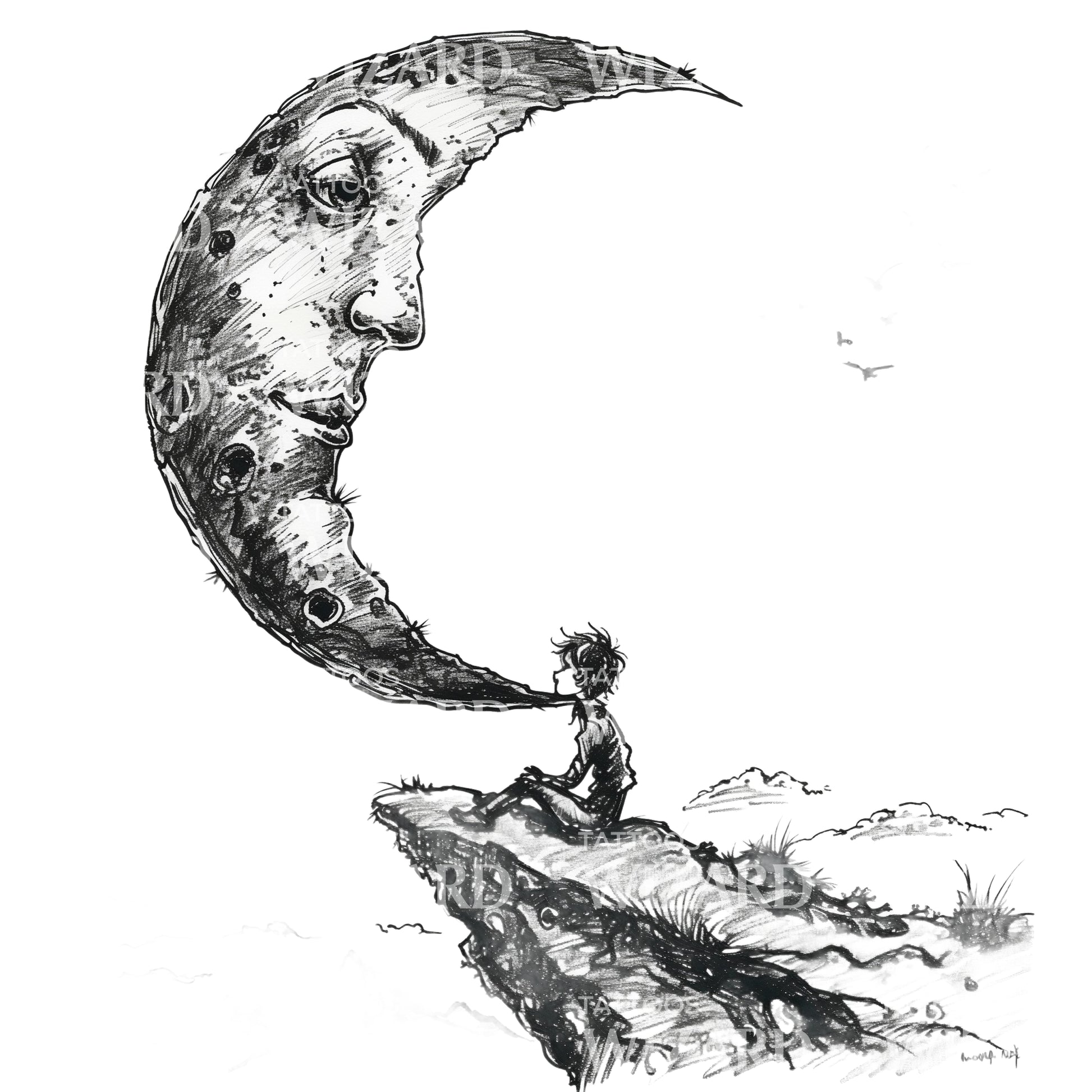 踏入想象的领域,欣赏这款精美的素描纹身设计。设计中描绘了一位年轻男孩与凝视的月亮进行迷人对话,象征着无尽的希望和梦想。这件迷人的作品捕捉了童年奇妙的纯真,完美适合那些心中依然年轻的人。