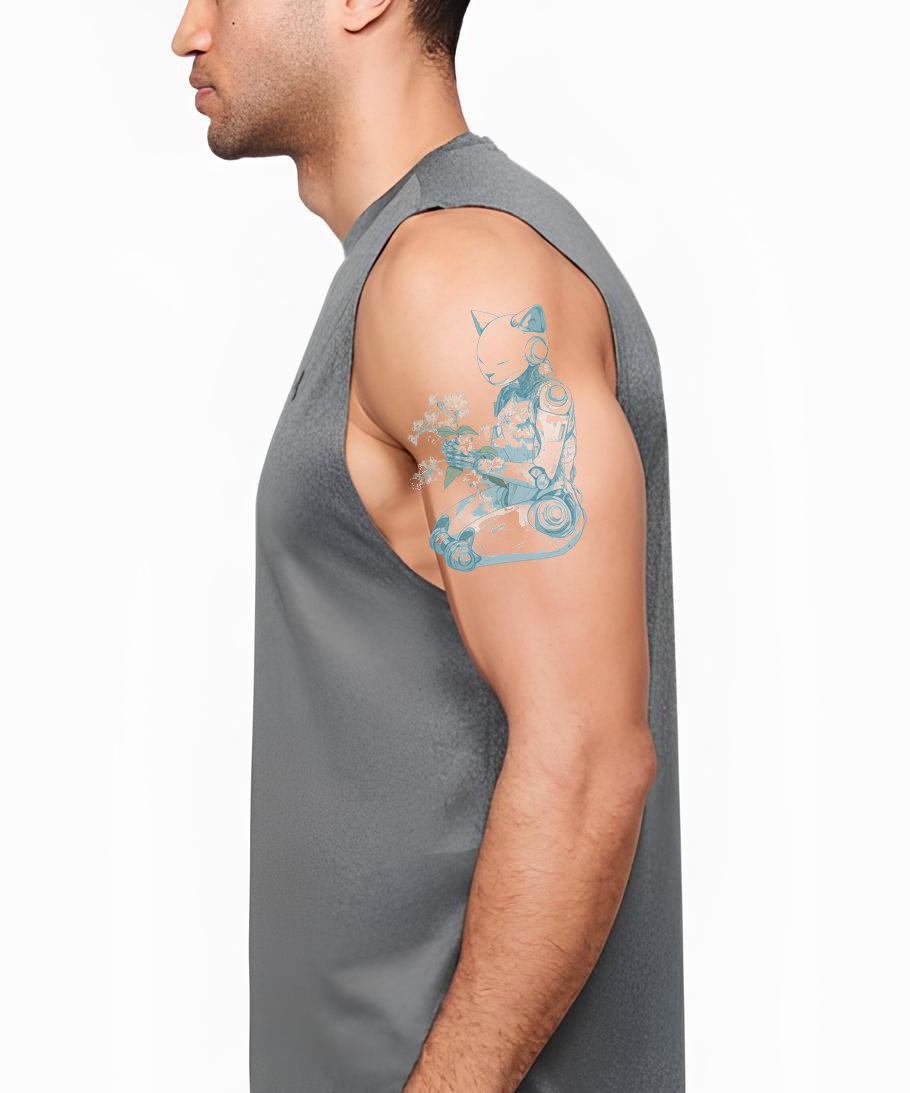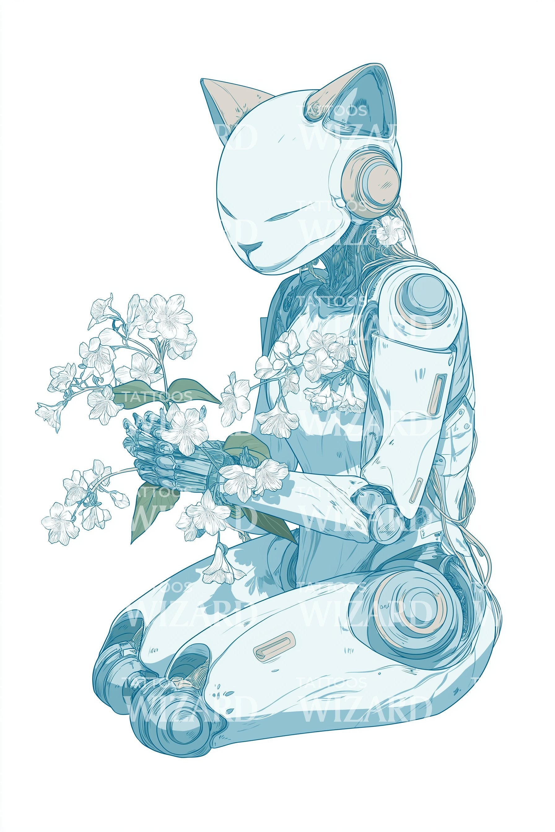 这款水彩纹身设计巧妙地融合了宁静与赛博元素。一只禅意十足的机器人猫科动物,点缀着柔和的花朵,唤起平静的感觉。科技与自然的结合,以水彩色调呈现,为典型的猫科和赛博主题身体艺术提供了独特的视角。
