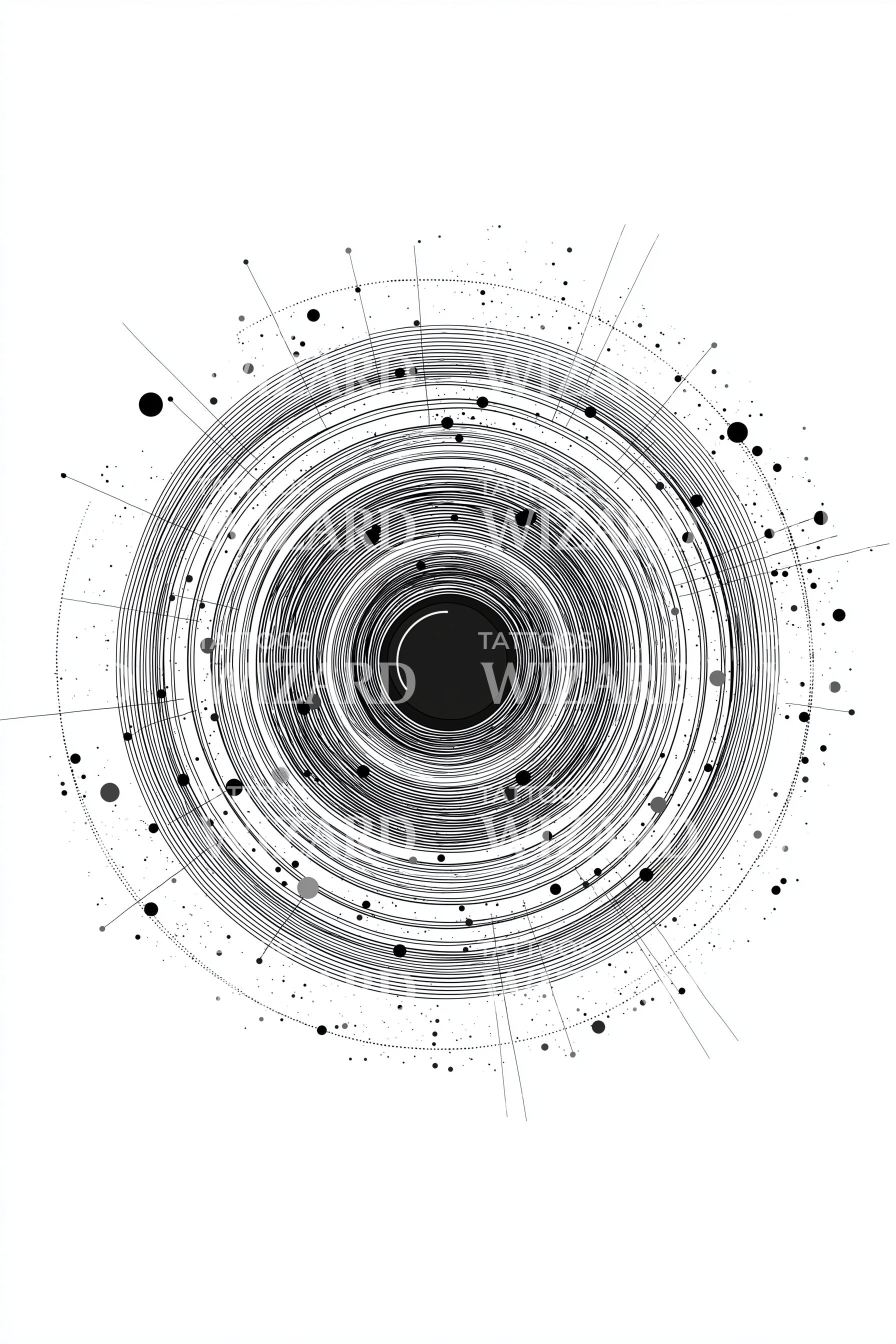 Orbiting rings and precise linework form a geometric halo of tech precision around a dark core, dotted with circuit-like nodes and splashes that suggest data, planets, and motion. Symbolizes connection, centered mind, and evolving cycles. Wearing it feels like carrying a signal, futuristic, orbiting with purpose and infinite possibility.