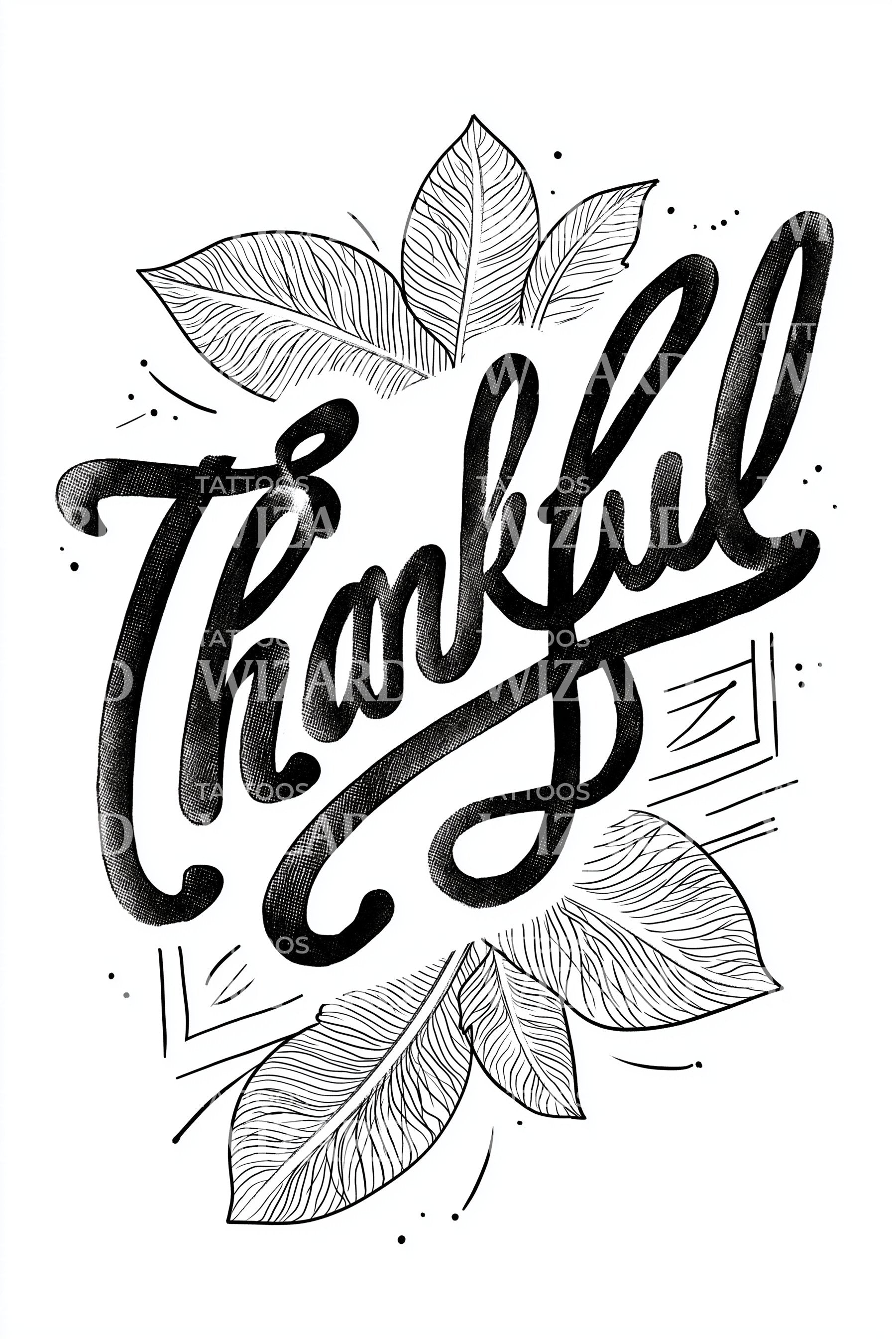 Hand-brushed script blooms with velvet shadow, spelling Thankful amid fine-lined leaves and playful ink flicks. Each leaf marks seasons of growth; layered shading grounds gratitude in the present. Worn close, this design feels calming and rooted, a daily breath of appreciation, soft yet strong, for a grateful heart.