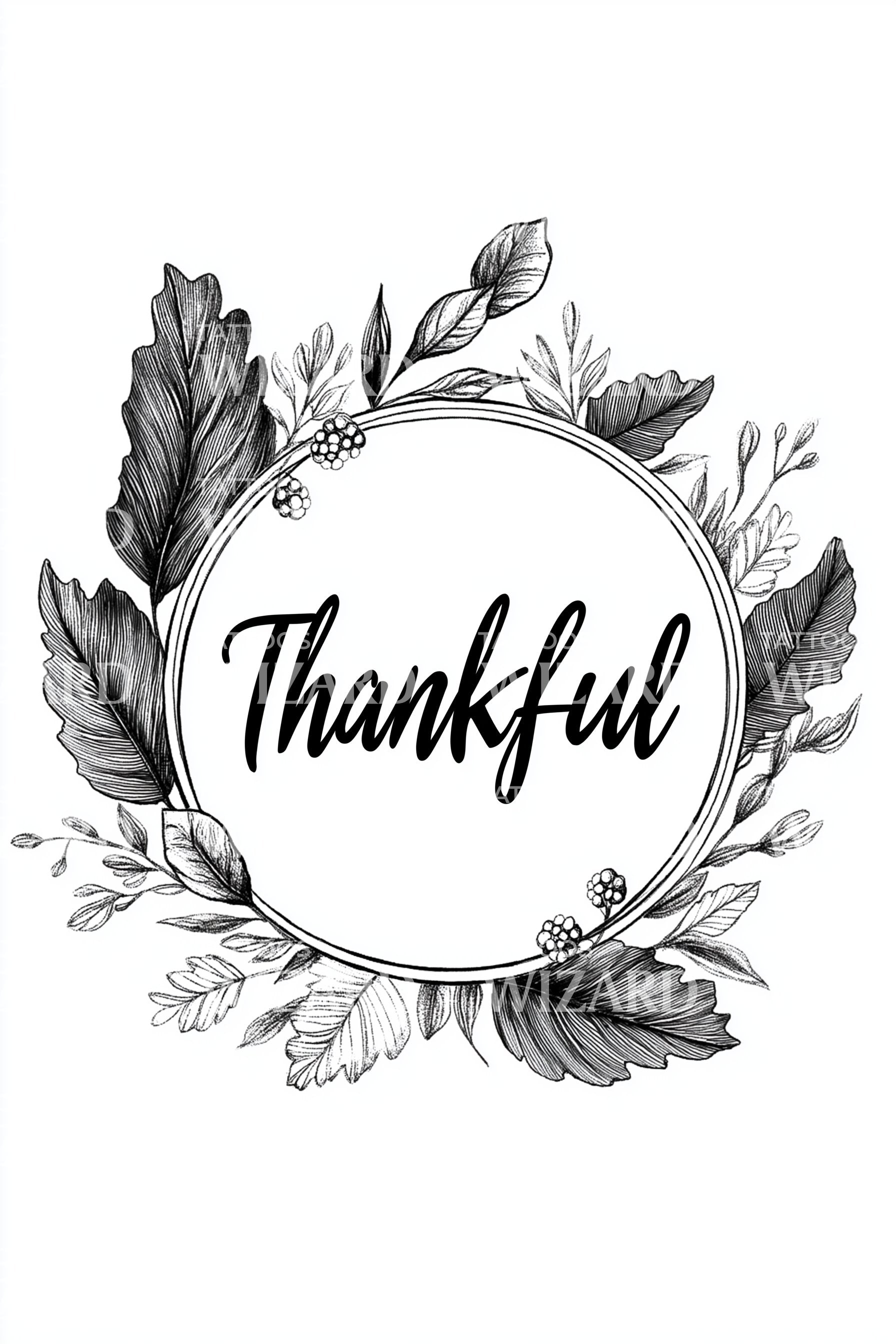 Botanical ring of gratitude, this design pairs lush inked leaves and tiny berry sprigs around a clean circle framing the word Thankful. The wreath symbolizes cycles, growth, and abundance. Wearing it feels grounded and serene, a quiet reminder to let appreciation bloom in everyday moments of the heart.