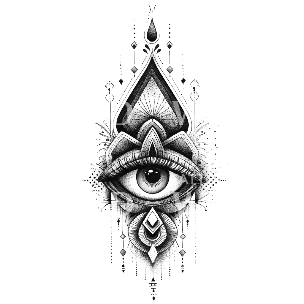 沉浸在灵性中,这款黑灰色纹身设计巧妙地结合了点刺和脉轮元素。以一个迷人的眼睛为中心,这件作品散发出深刻的启迪和个人成长的感觉。用这件灵性、平衡的艺术作品装饰你的肌肤。