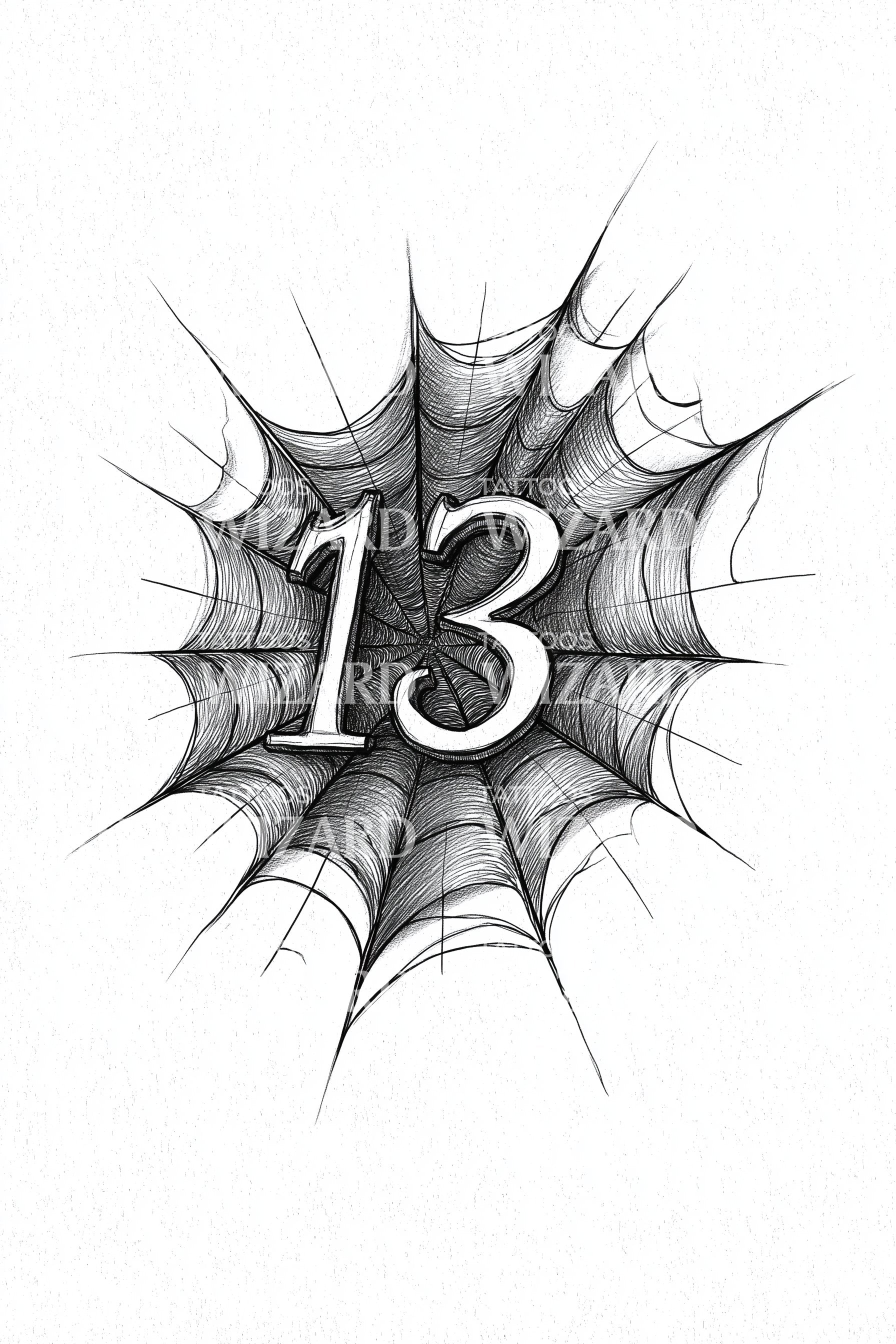 用这款引人入胜的黑灰纹身设计装饰你的肌肤。设计中巧妙地将数字十三符号与蜘蛛网交织在一起,独特地诠释了幸运与机遇。细腻复杂的线条爆发出鲜明的视觉冲击,使其成为任何纹身爱好者眼中的杰出作品。