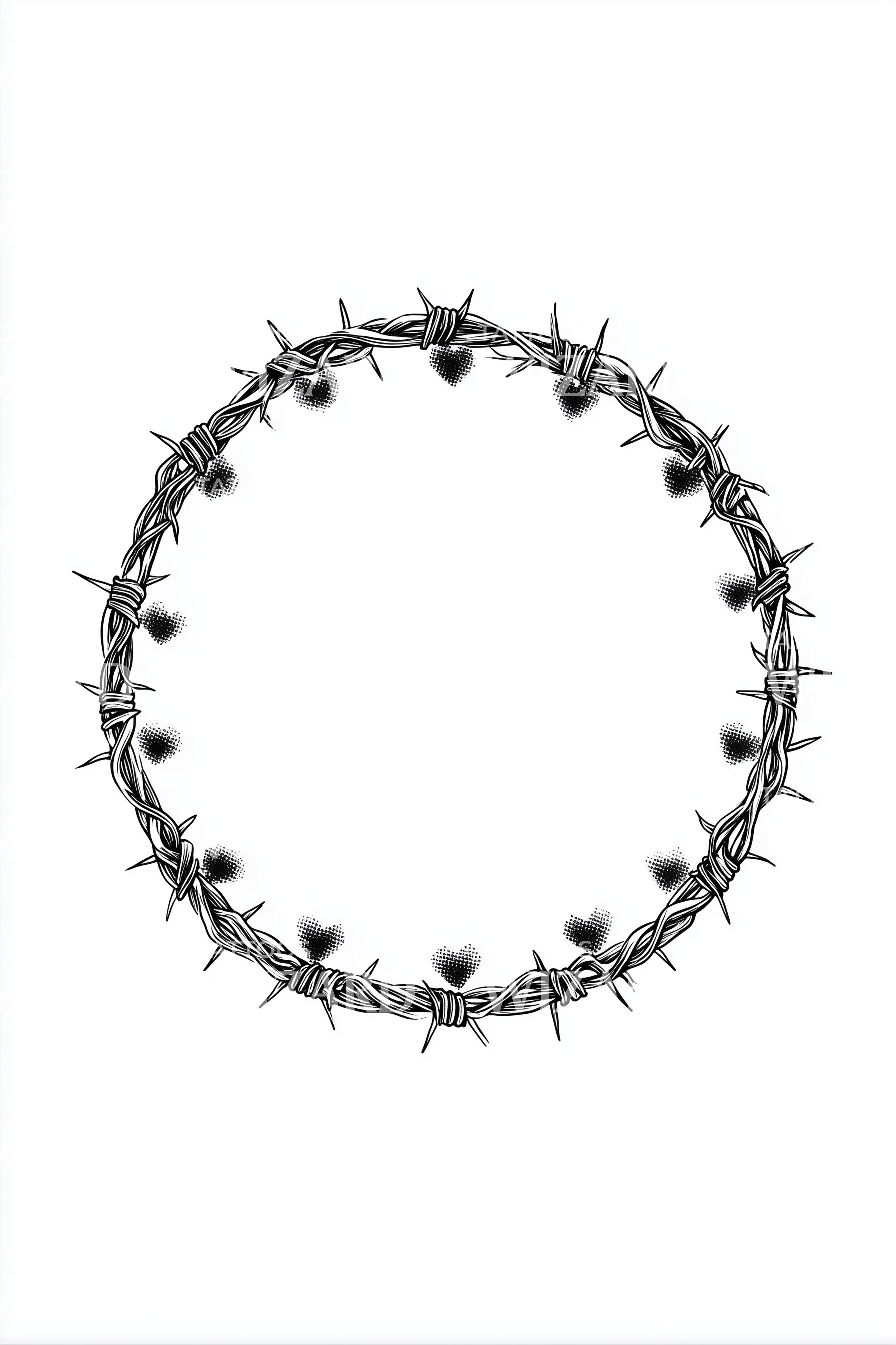 Blackwork circle of interlaced thorns forms a minimal wreath, barbed knots casting soft stipple shadows around clean negative space. A crown of endurance, it turns trials into devotion, faith, and protection, sealing an unbroken cycle. Worn close, it gives steady daily resolve, quiet grace, and sacred, grounded strength.