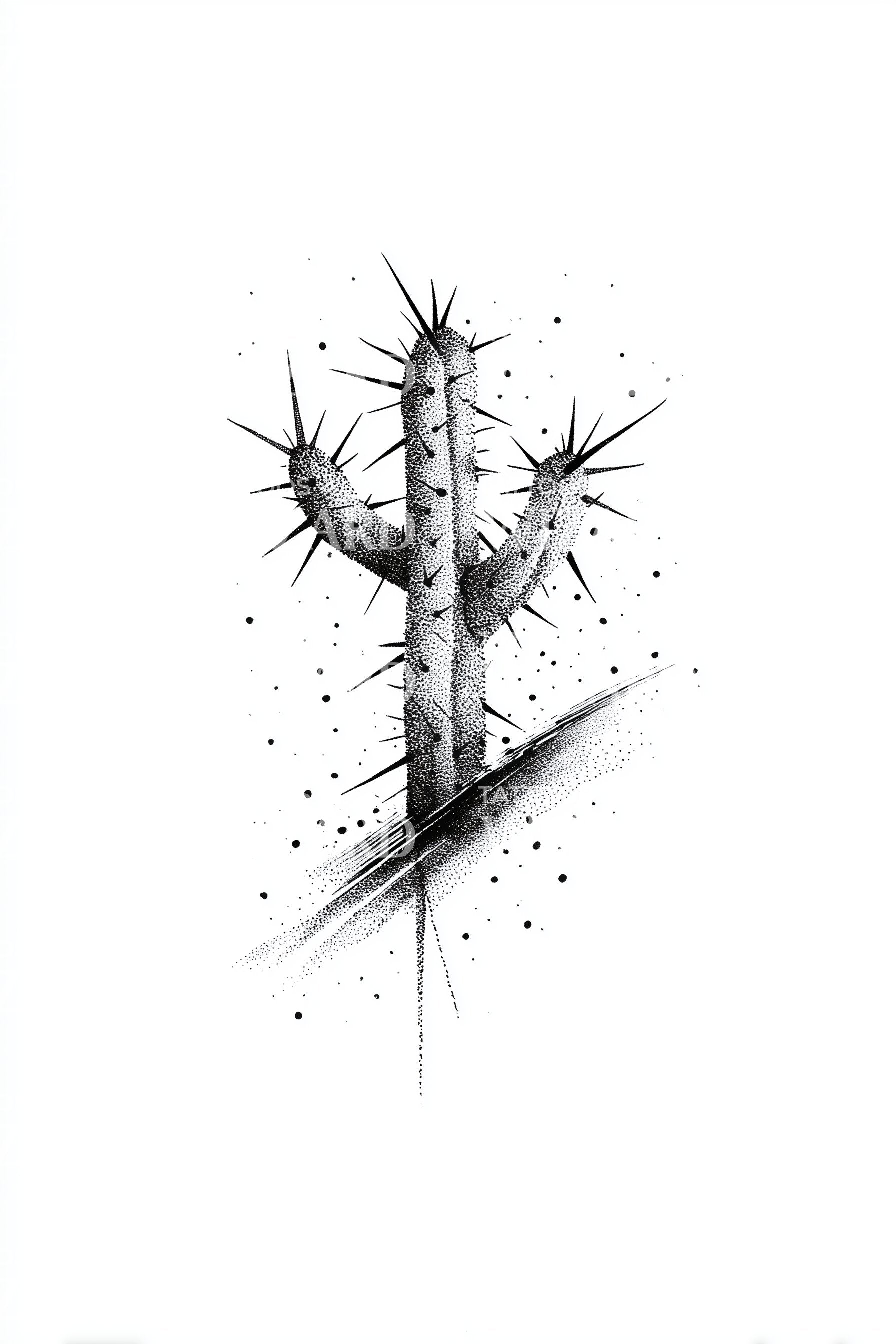 Ink-sketched cactus rises from a streaked base, stippled shadows and thorned branches and spikes amid abstract splatter. Speaks of resilience, strength, nature-born survival. Worn, it feels calm yet defiant, grounded. Best on forearm for vertical flow; calf for stature; along spine for rooted ascent; ribcage for curve.