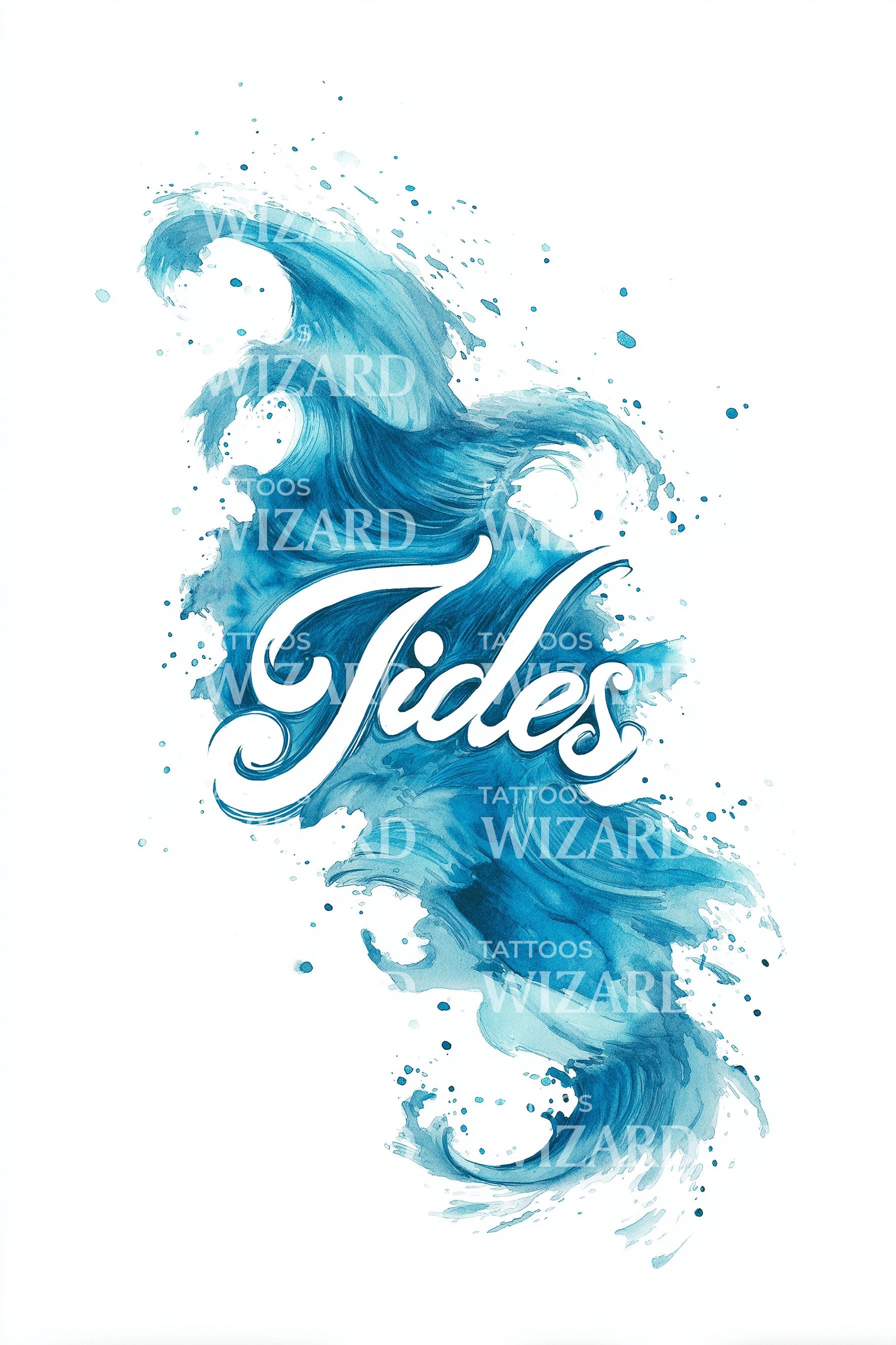 Watercolor waves surge around elegant calligraphy, the script Tides glowing like seafoam. Ocean blues curl and splash with airy translucence, capturing the moon-pulled rhythm of change. Symbol of resilience and return, this design whispers trust the flow. Wear it for calm courage, fluid grace, and timeless movement always.