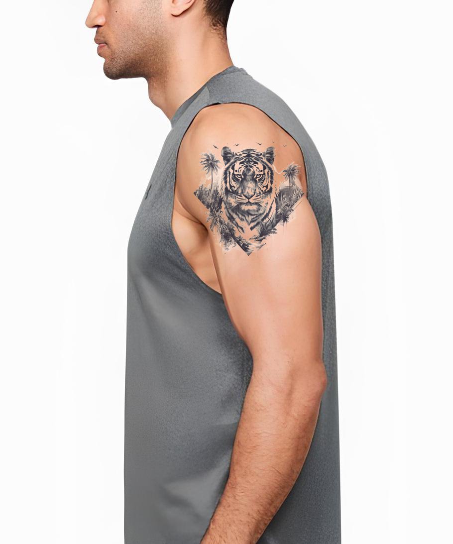 沉浸在野外,这款黑灰色的纹身设计令人惊艳。设计中有一只凶猛的老虎,从丛林密集的棕榈树中跃出,十分引人注目。神秘的钻石的加入更增强了其美学吸引力。对于动物爱好者和热爱大自然的人来说,这是一个卓越的选择。