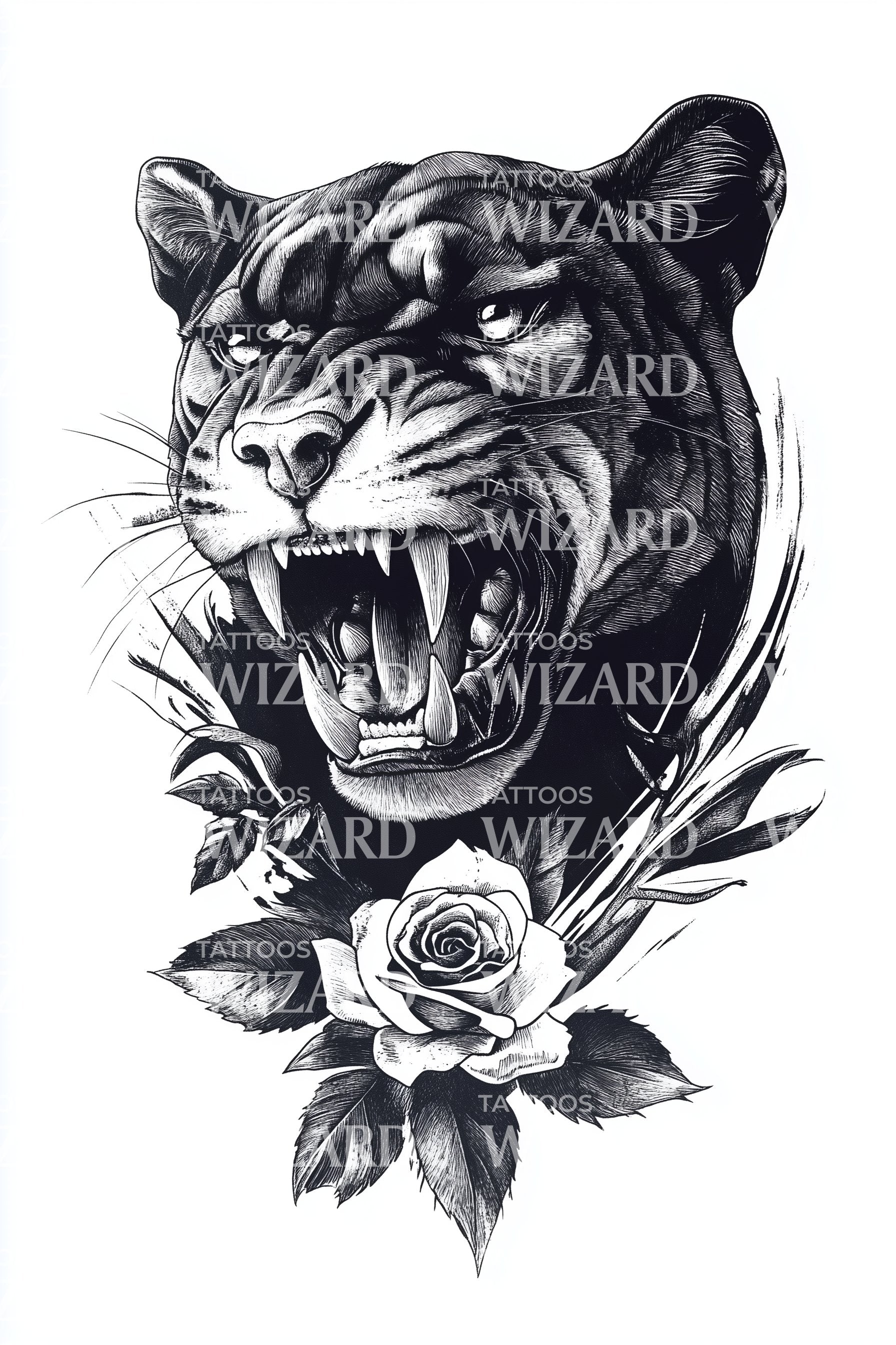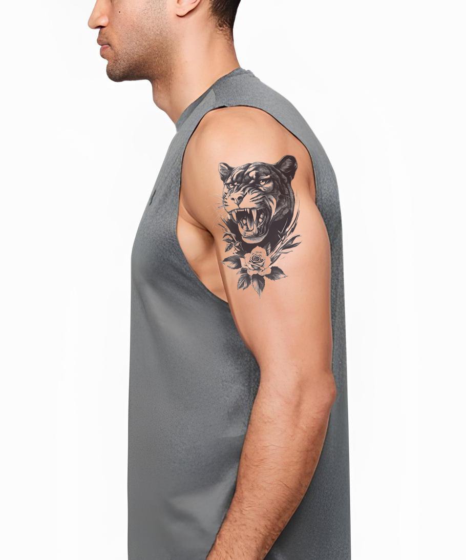 释放你狂野的一面,这款黑工纹身设计巧妙地展现了老虎的咆哮力量,栖息在绚丽的玫瑰丛中。它回响着野生动物的原始力量与花卉的细腻优雅完美融合,是美与兽交织的绝佳诠释。