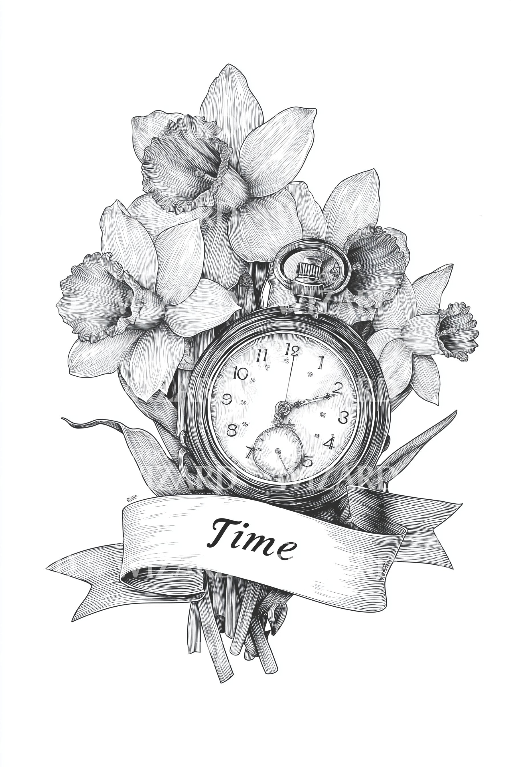 沉浸于时间之美,这款插画风格的纹身设计展现了精致的时钟,被鲜艳的水仙花环绕,捕捉了转瞬即逝的瞬间精髓。一个华丽的花卉纪念品,散发着大自然的魅力,完美适合珍惜时间与美丽的你。
