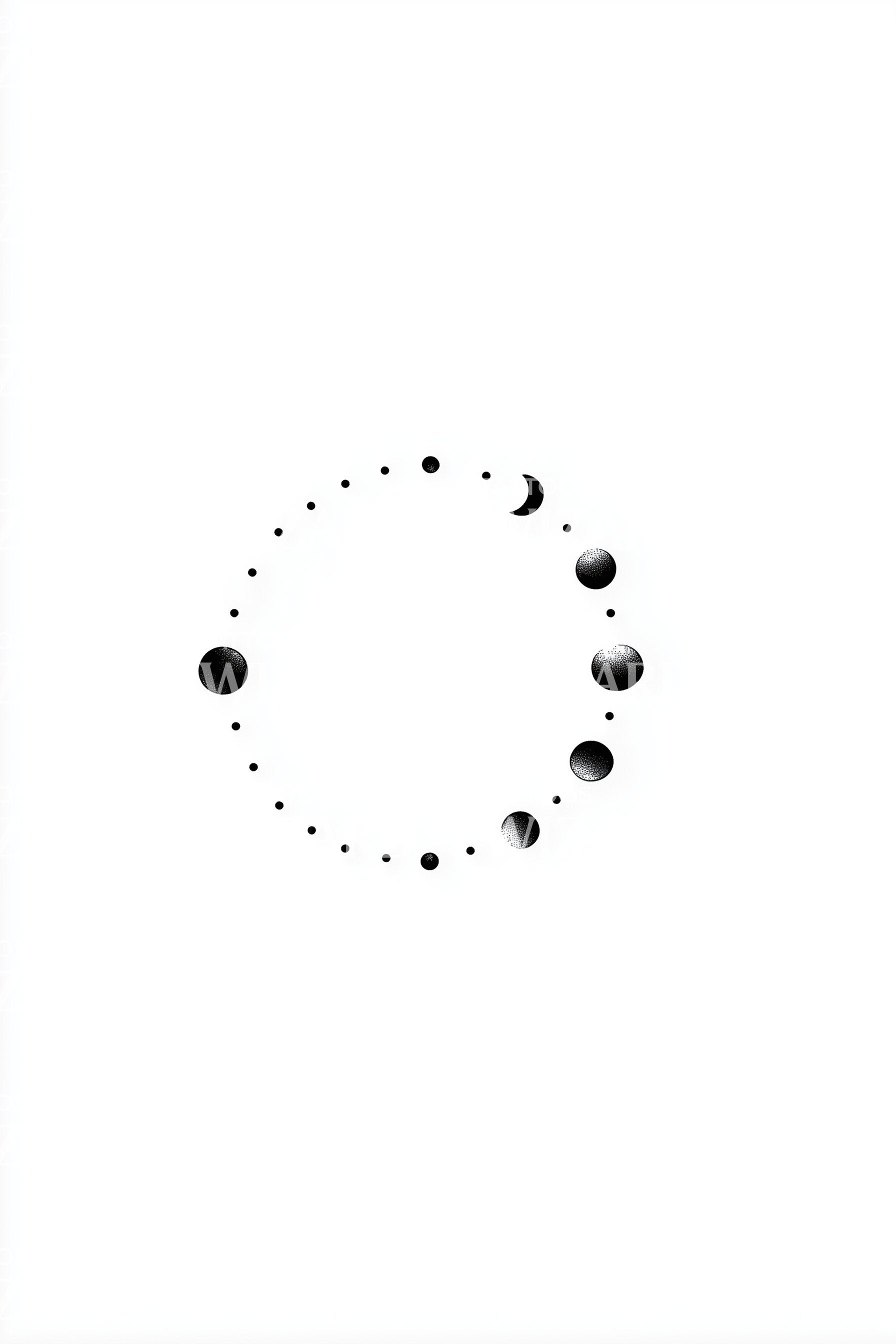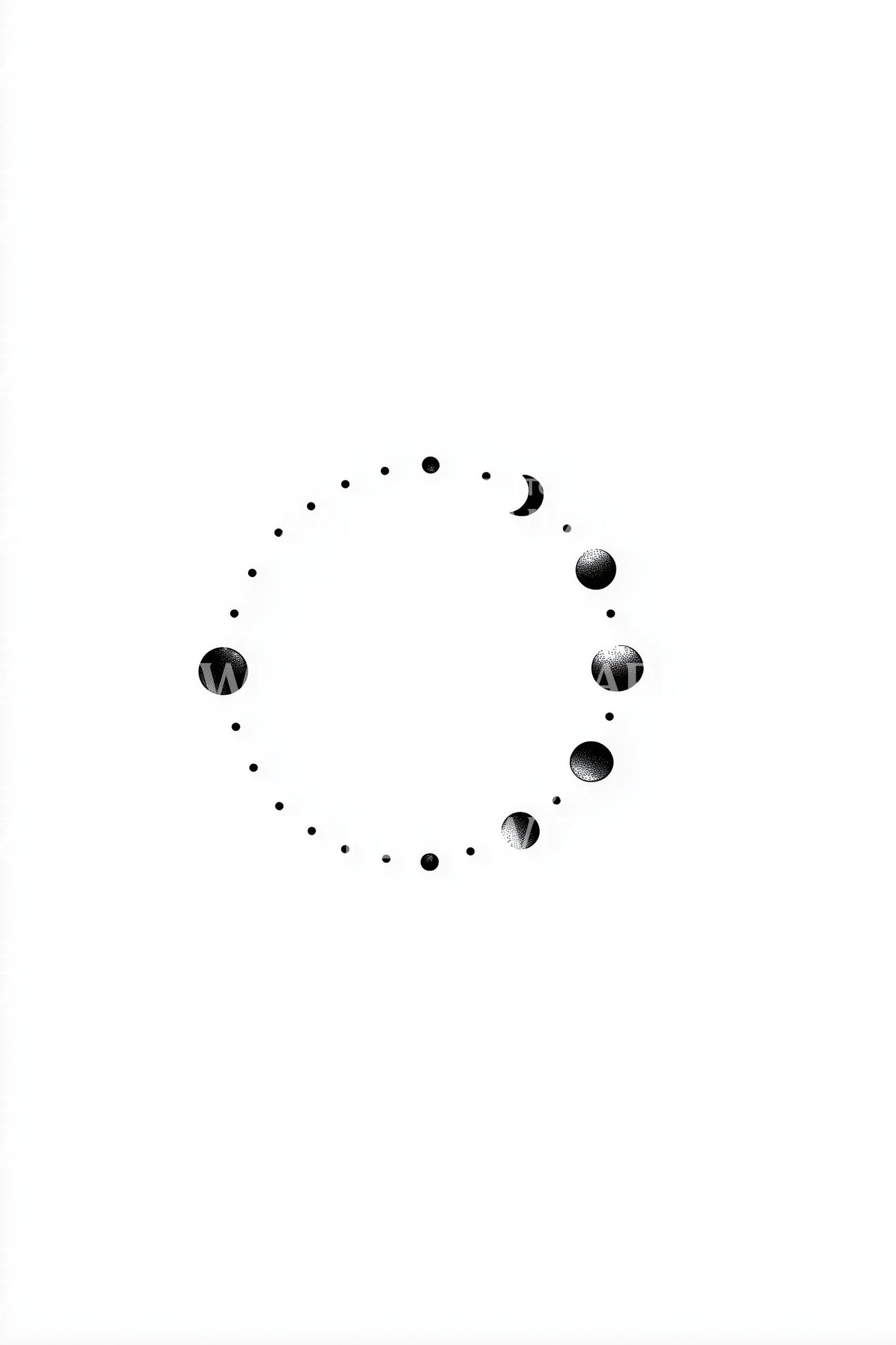 Blackwork ring of celestial bodies forms a minimal orbit: shaded planets, a crescent, and whispering dots tracing time. Each sphere marks cycles, growth, and return, a compass for inner gravity. Worn on skin, it feels calm, steady, quietly cosmic, inviting presence, perspective, and infinite possibility with gentle wonder.