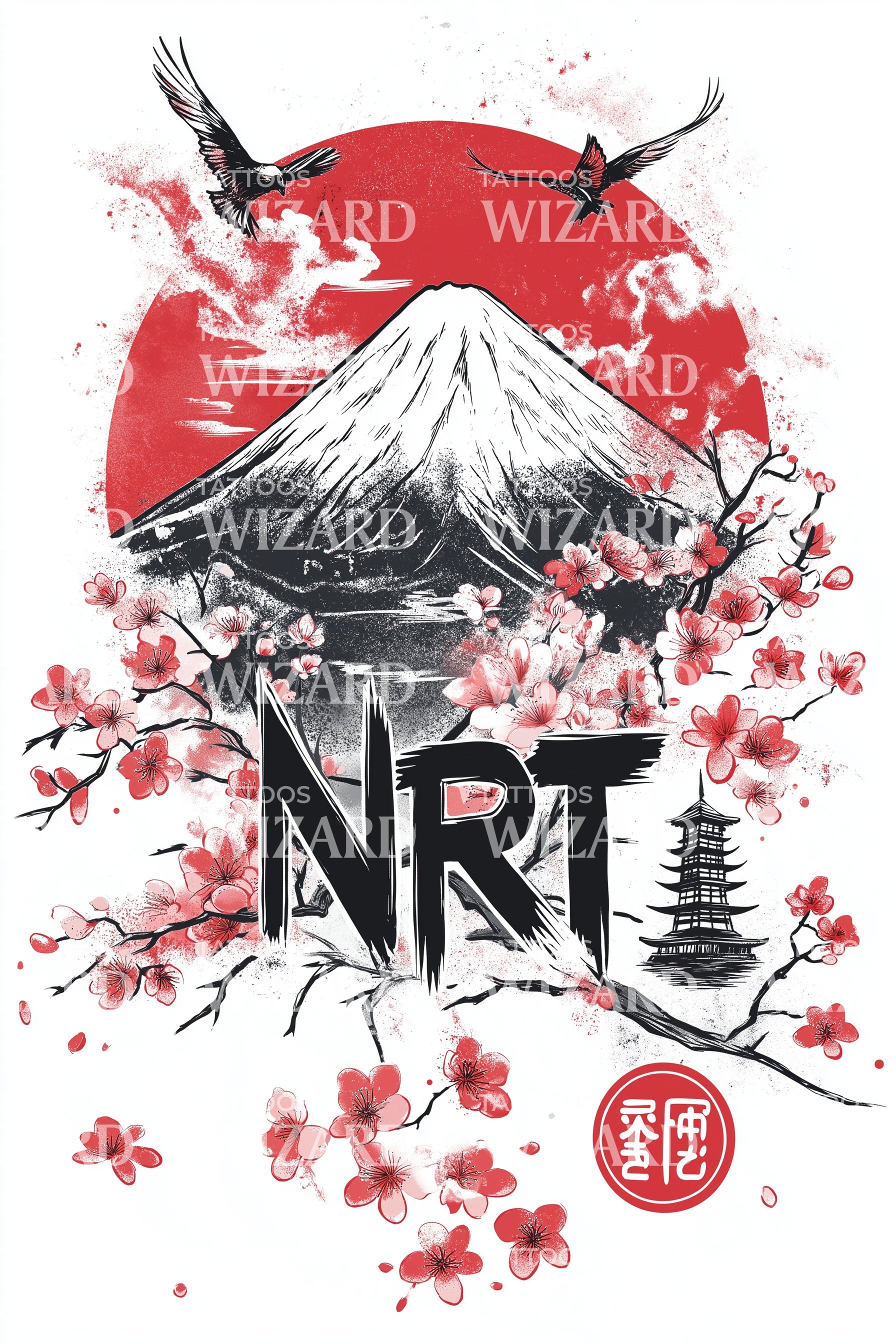 Brushstroke energy meets tranquil sumi-e. Fuji rises beneath a redsun, sakura drift around a pagoda, swallows loop above bold NRT. Symbolizing steadfast spirit, fleeting beauty, safe travels, and Tokyo homecomings, this design carries wanderlust and calm resolve. Wear as a talisman for return, renewal, and unmistakable Japanese soul.
