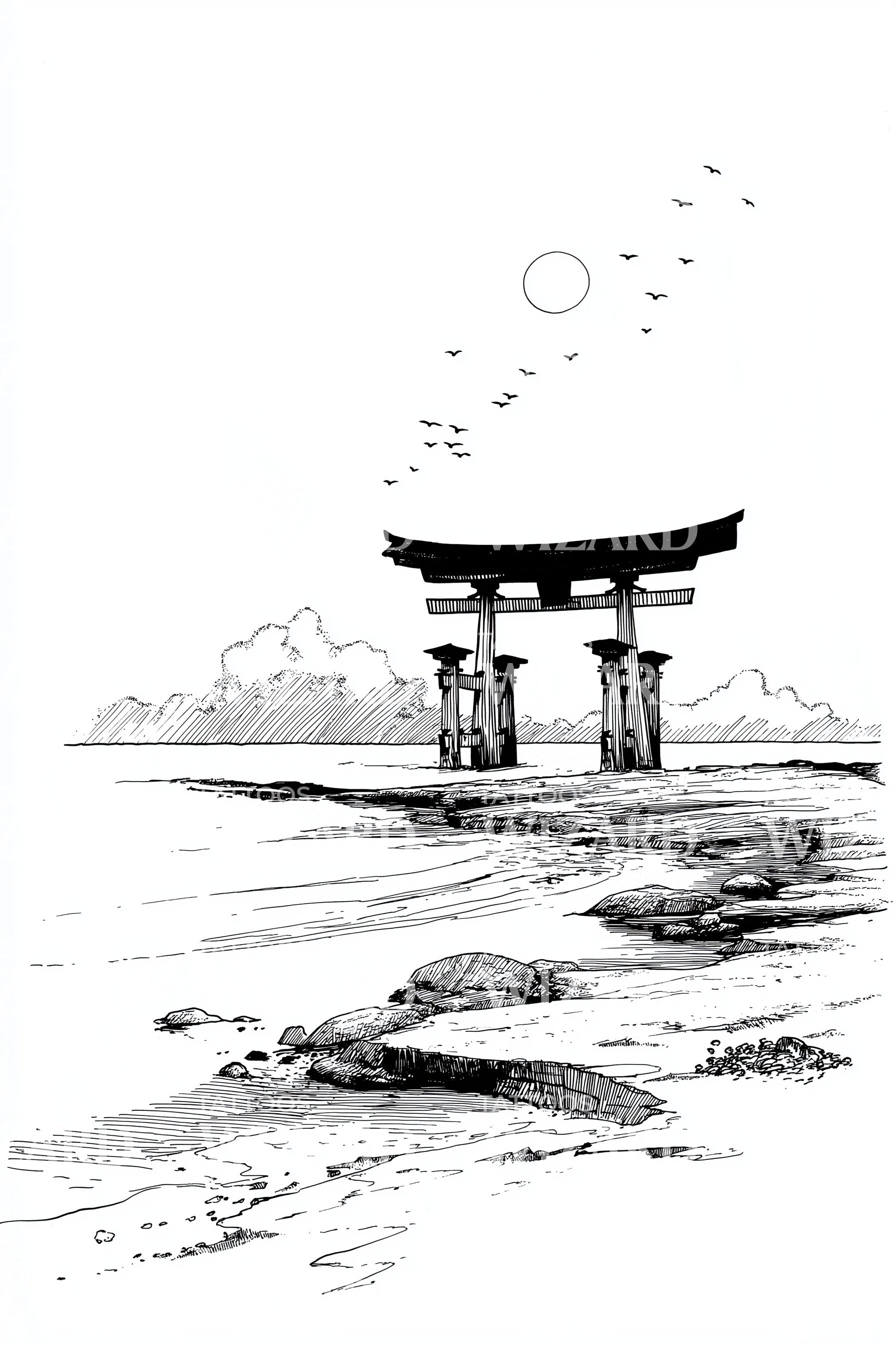 沉浸于日本的宁静之中,这款禅意纹身设计捕捉了标志性的鸟居门,置于宁静的风景中,体现了传统日本墨艺的神秘之美。文化、自然与美学的和谐融合——它是通往日本宁静世界的便携之窗。