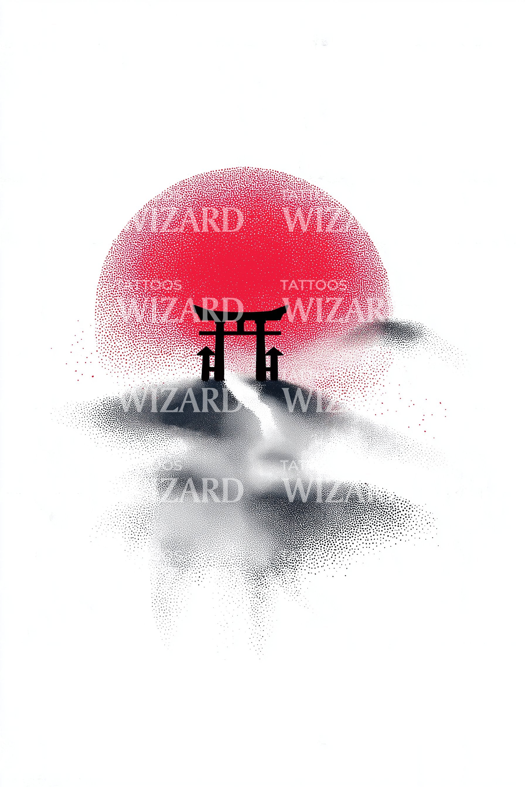 沉浸于日本神秘魅力的水彩纹身中。纹身描绘了一座沐浴在旭日光辉中的鸟居,象征着深刻的精神旅程。此纹身设计巧妙融合了鲜艳的红色调,体现了与日本象征意义的崇高联系。