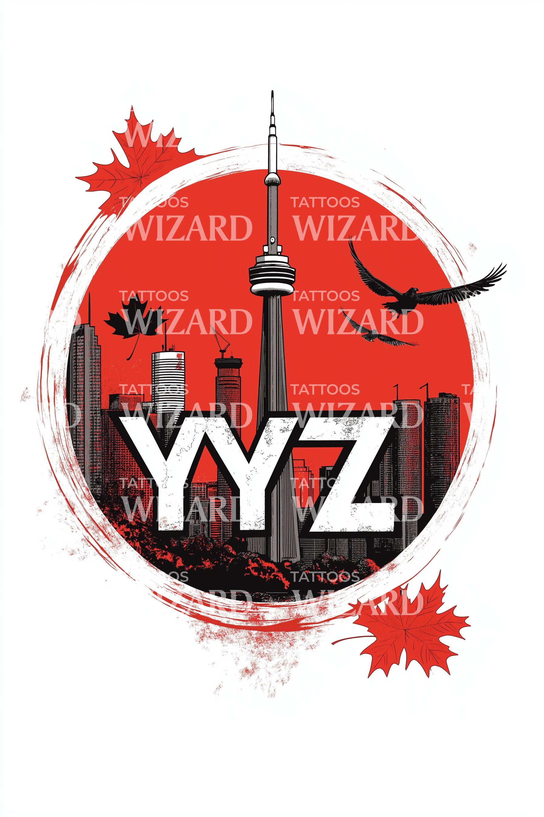 Watercolor red sun blooms behind Toronto’s skyline, the CN Tower piercing a soft, brushed circle while maple leaves and circling birds drift in ink. Stenciled YYZ anchors the scene, a code for roots and return. Symbolizing pride, momentum, and horizon-seeking spirit, this design feels bold, grounded, and free.