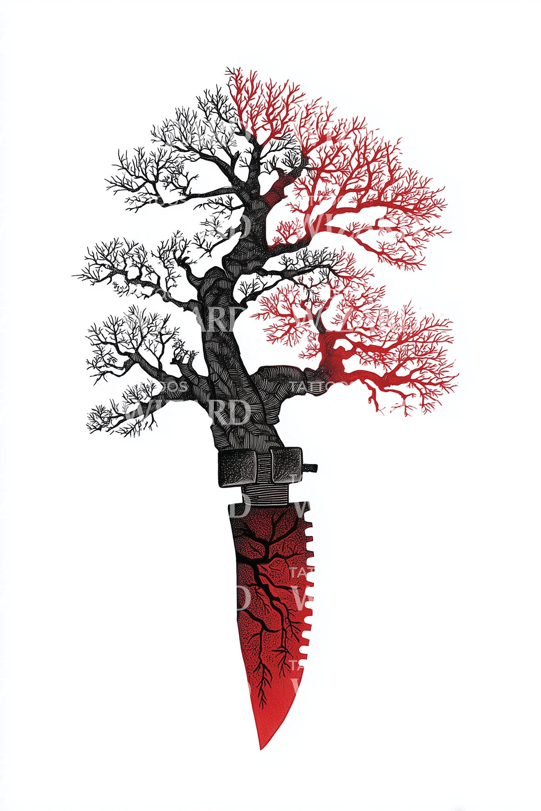 一幅水彩画的坚韧徽章:一棵被猩红色染透的树从纠结的根系中挺立,其树干缠绕着一把闪亮的匕首。红色的飞溅渗入柔和的渐变,象征着抵抗、牺牲与重生。非常适合那些在挣扎后标记重生的人,将力量扎根于自然,同时开辟新的道路与希望。